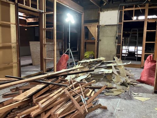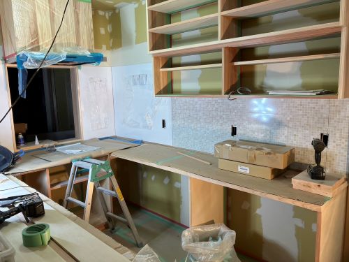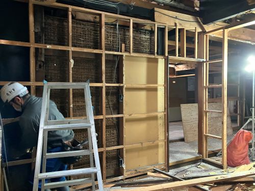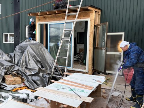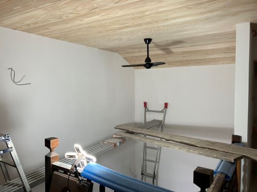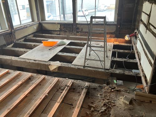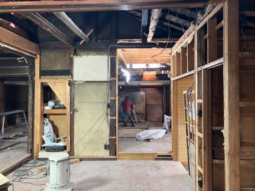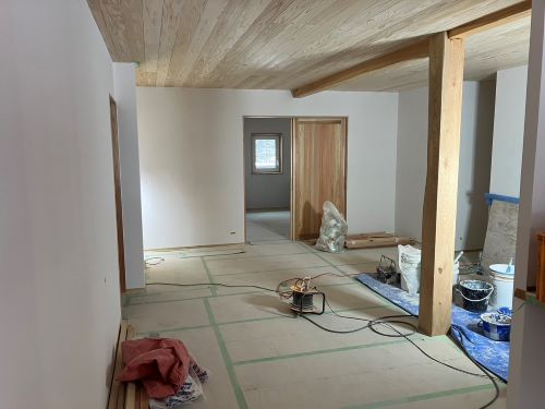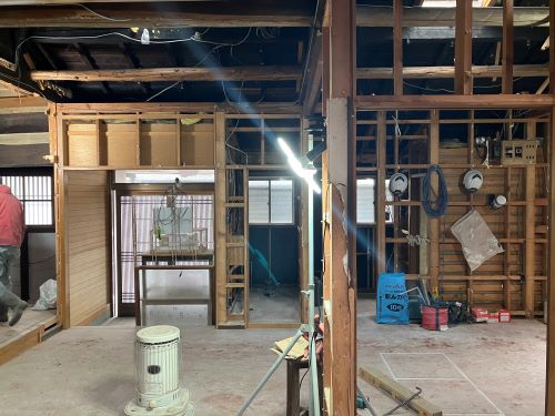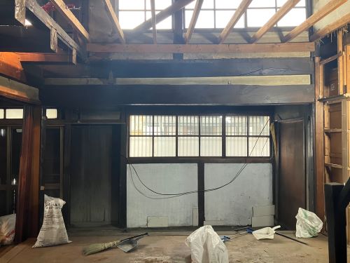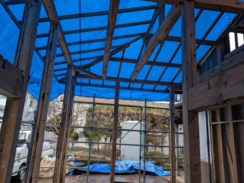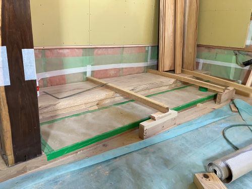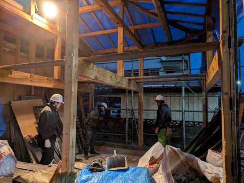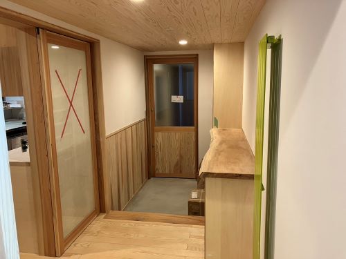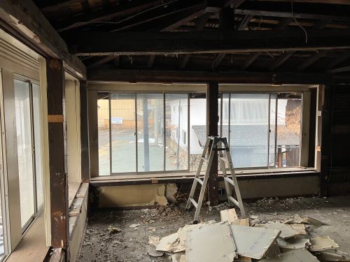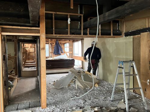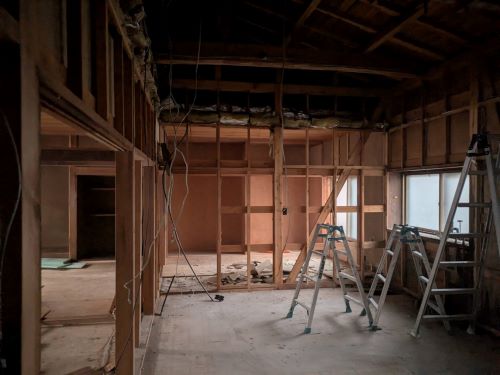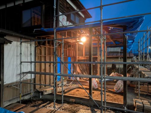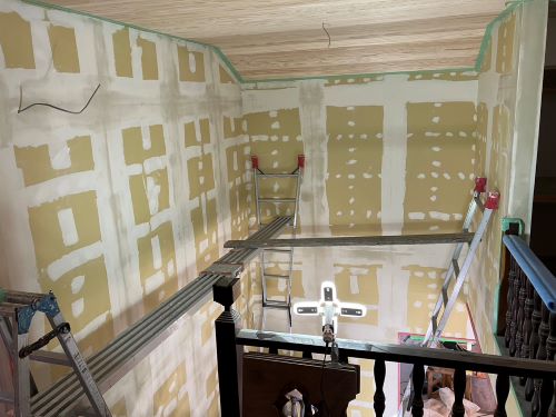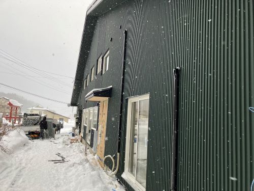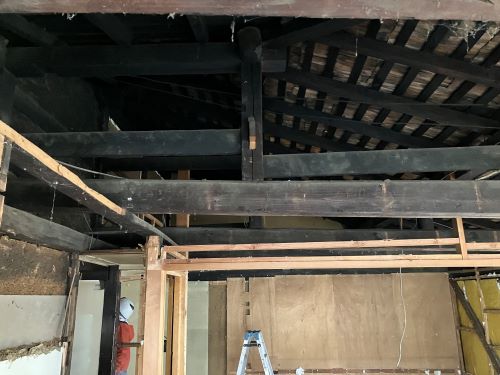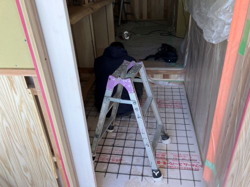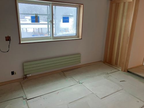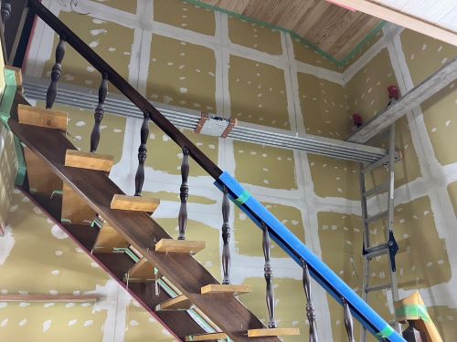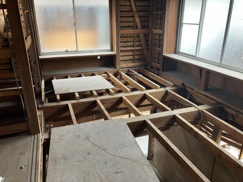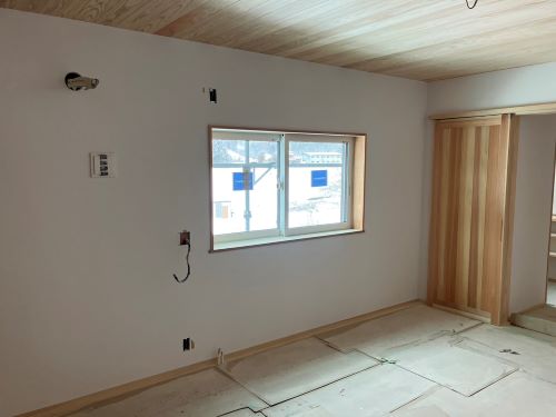 ボードの張り残しももう少しで完了です。既存階段の修理補強も進みました。建具工事も始まりました。