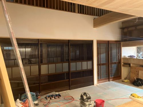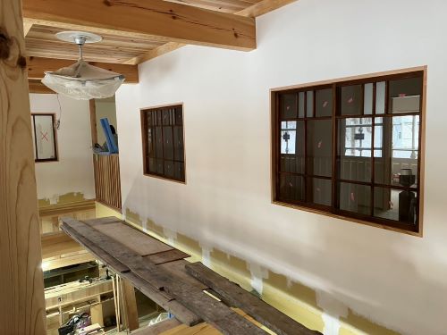 吹き抜け部にレトロなガラス戸が入りました。内装仕上げも頑張っています。
