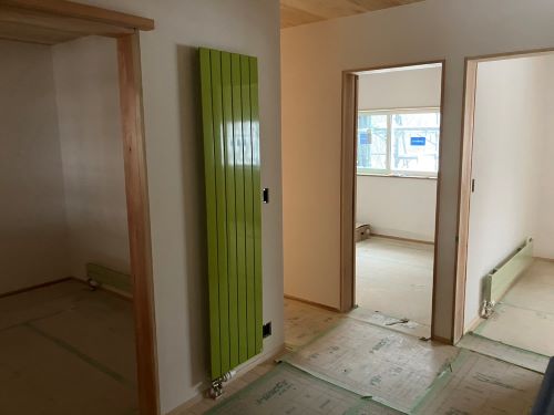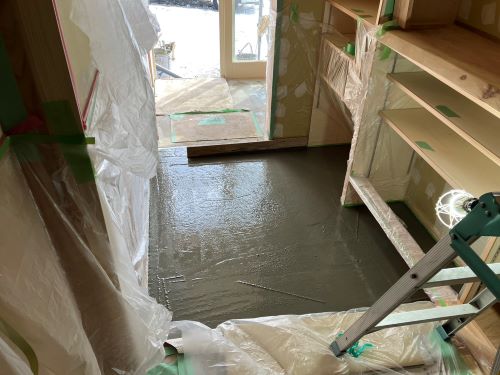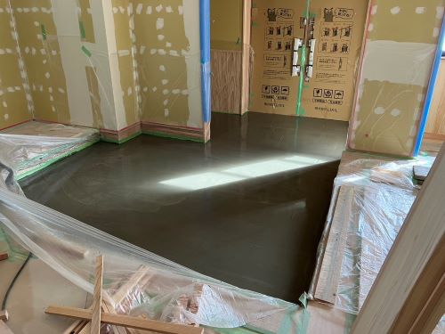 外部も大方となってボイラー出工事が始まりました。内装も仕上がってきて土間コンクリートの打設が進みました。
