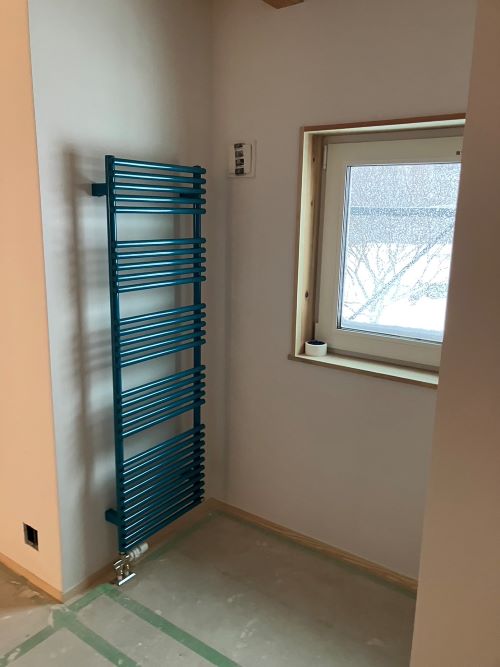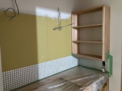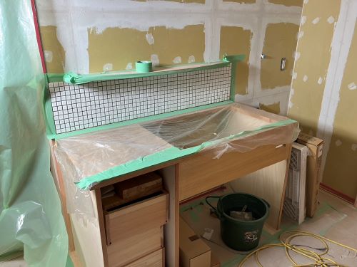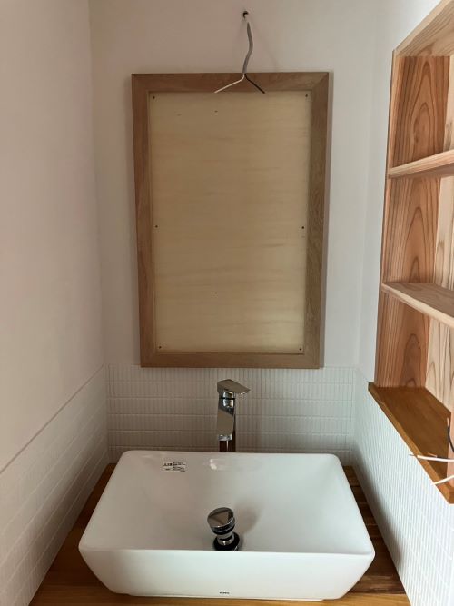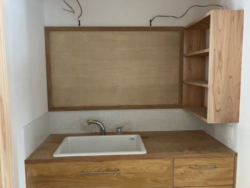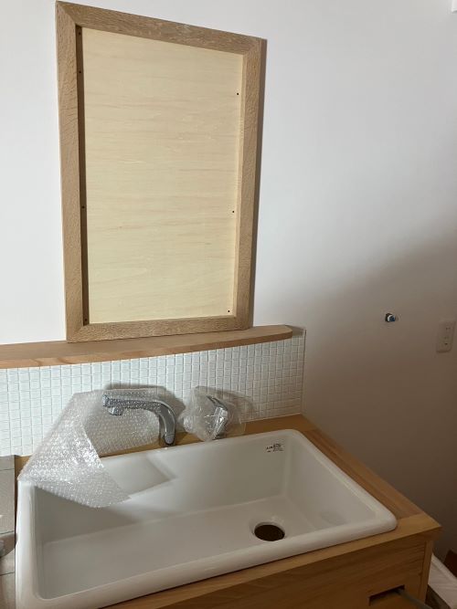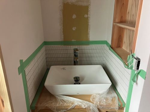 今回は洗面化粧台が3か所もあります。水撥ね部にはタイルが貼りこまれました。