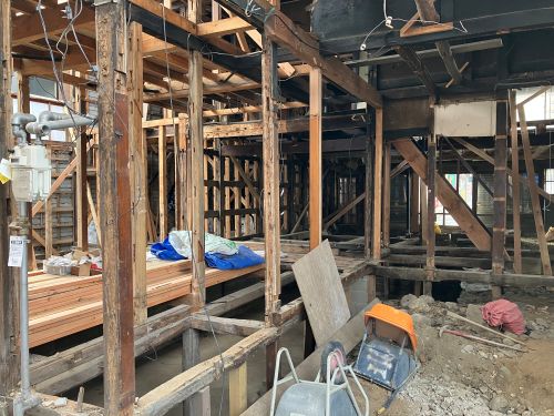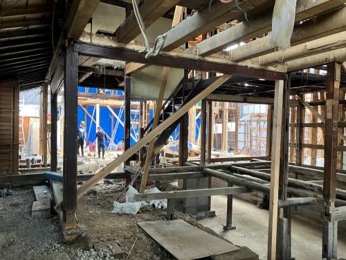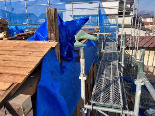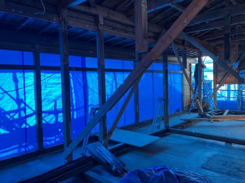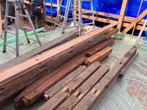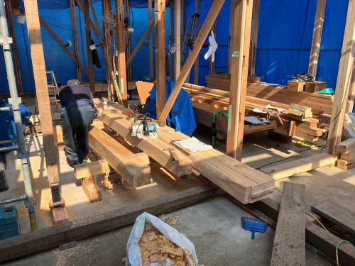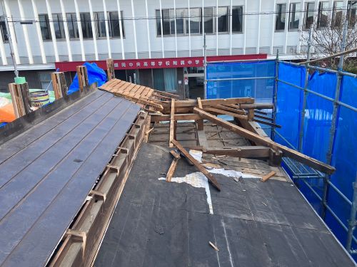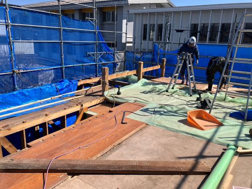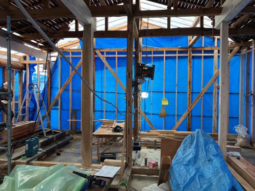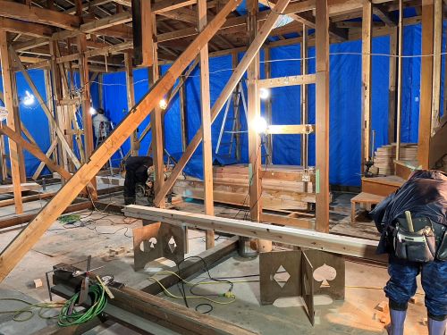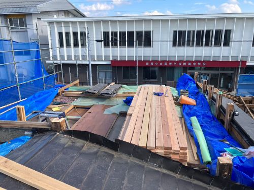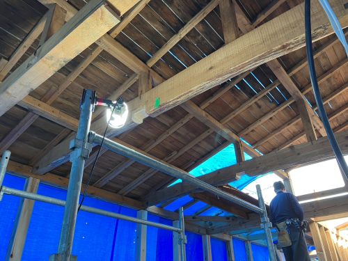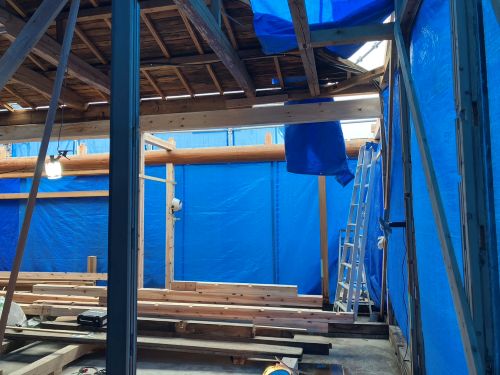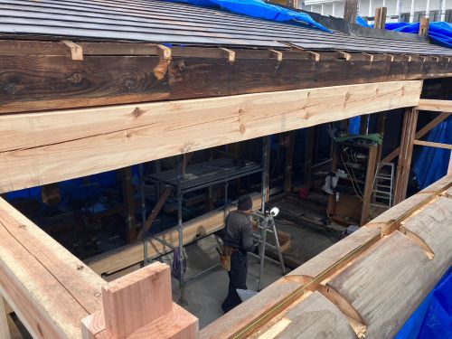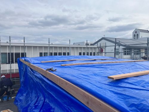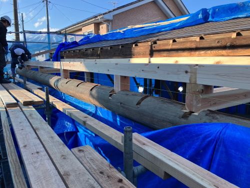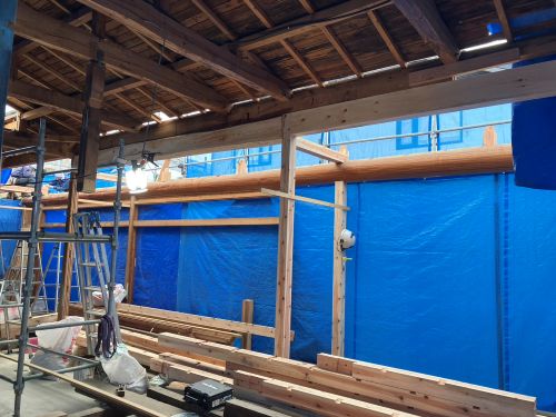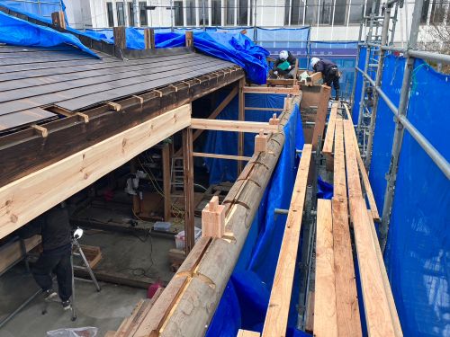 屋根下地工事が進みだしました。構造補強しながら橋の取り外しも進めていました。