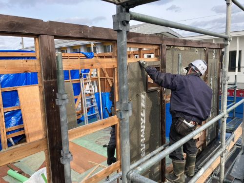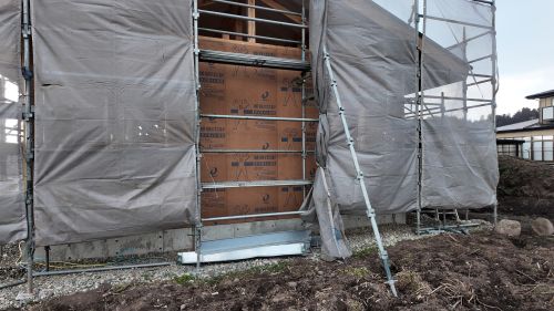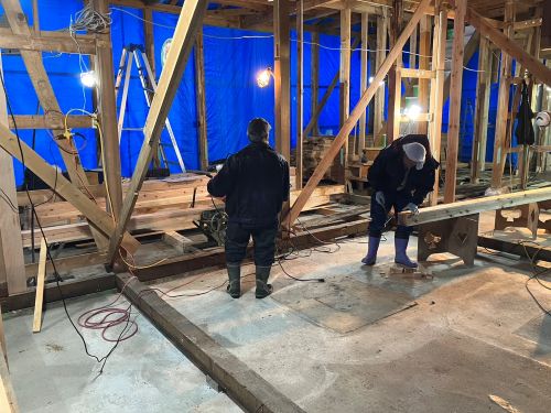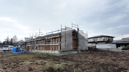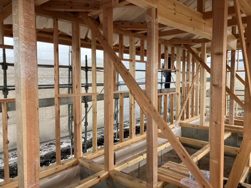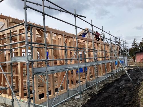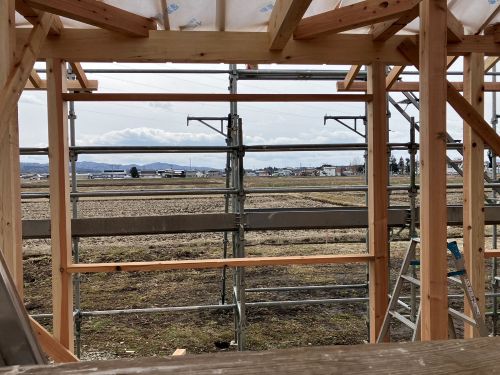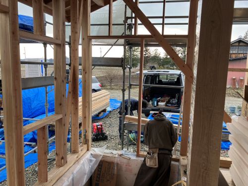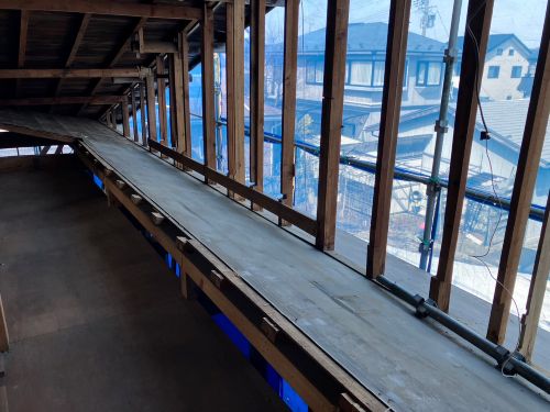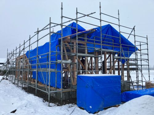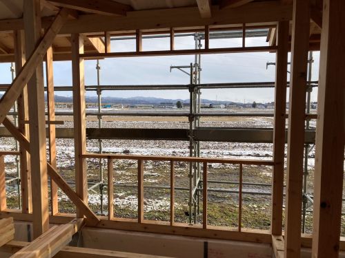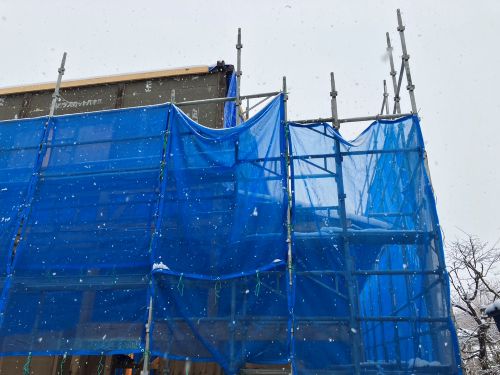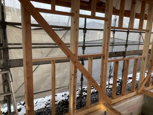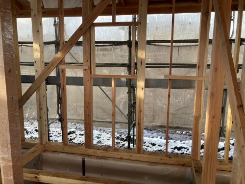屋根完了後は、雪が降っていますが、屋根の下で外壁の間柱取り付けが進みました。