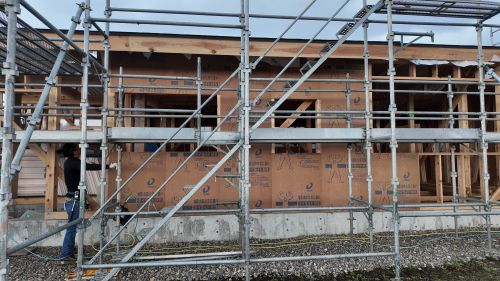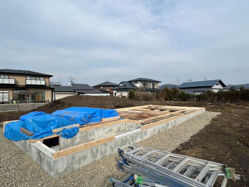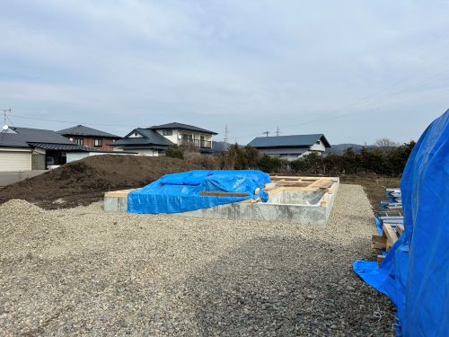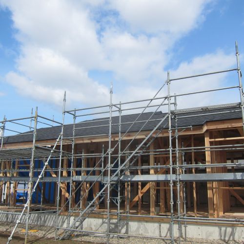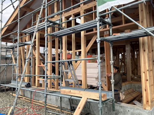土台を敷き終えて内部の仮床も進めて建込準備が出来てきました。本日足場を掛けます。