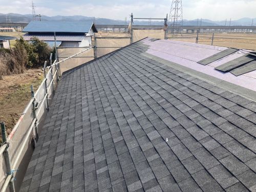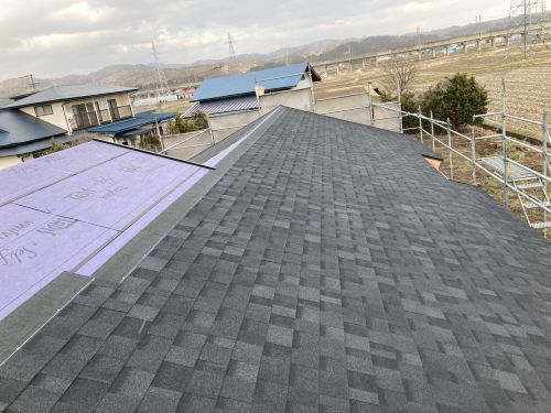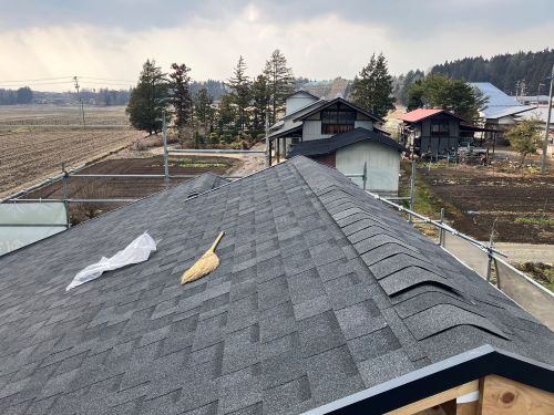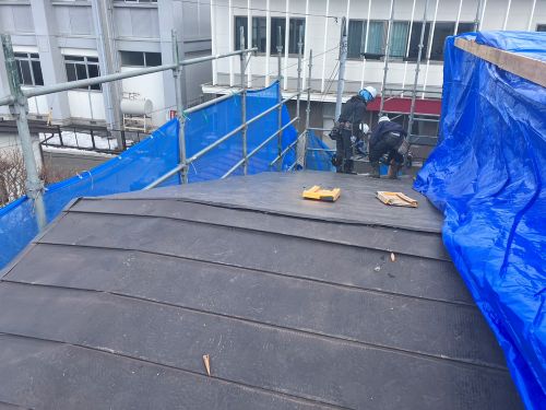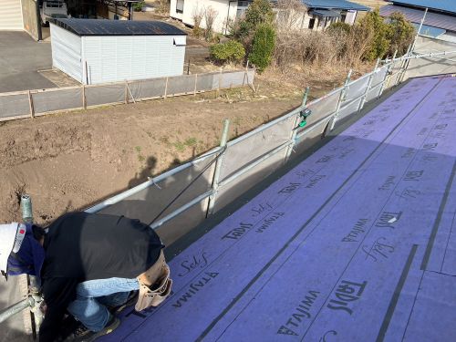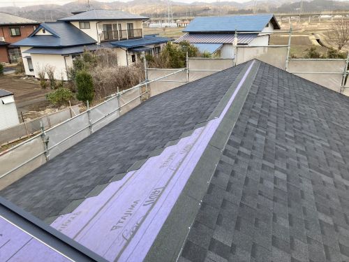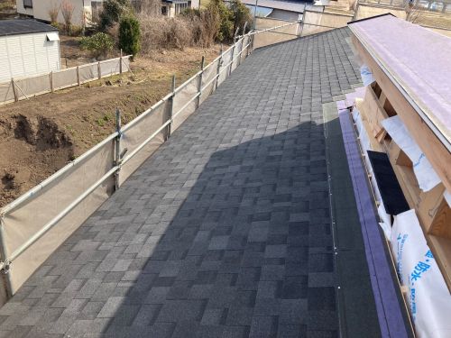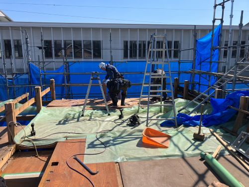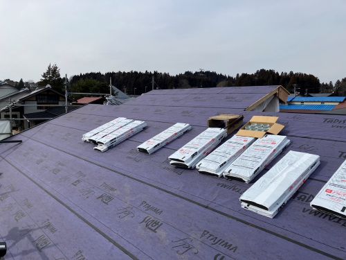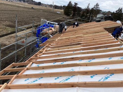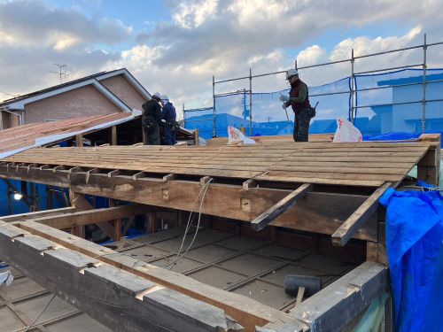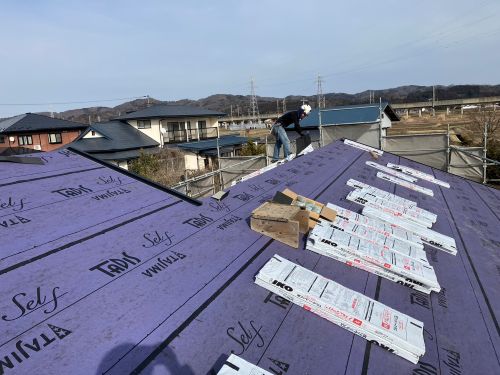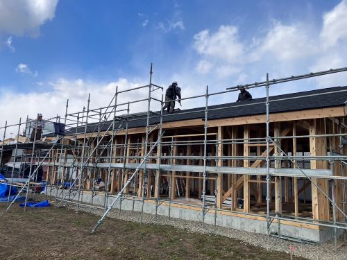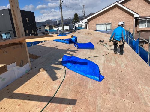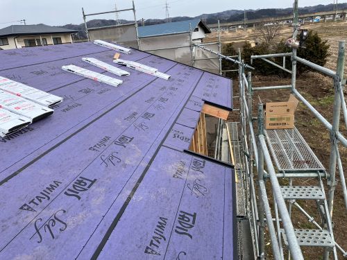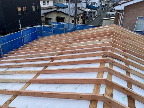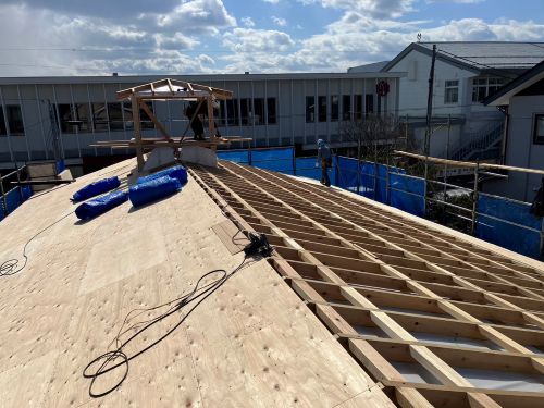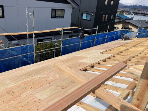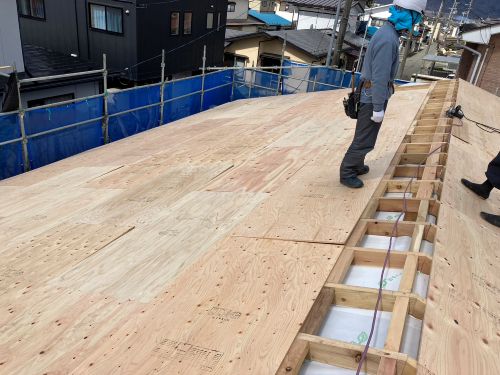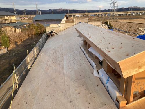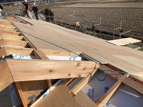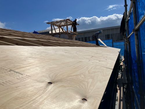 屋根構造面材となる屋根下地合板の張り込みが進みました。