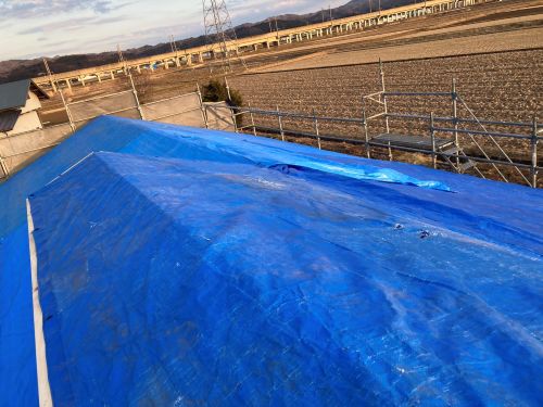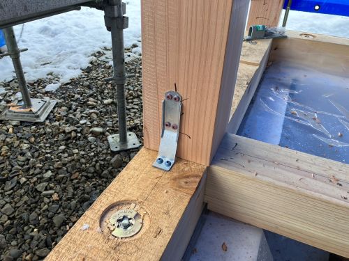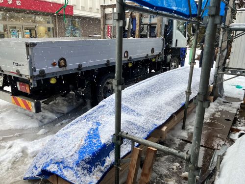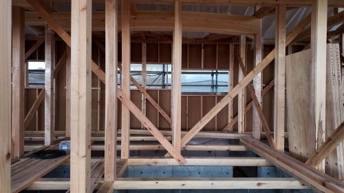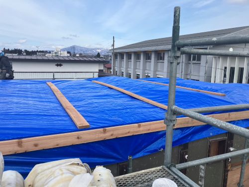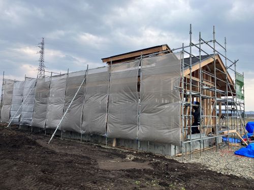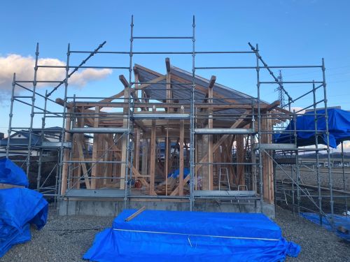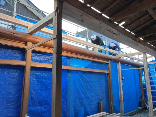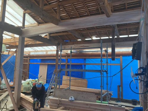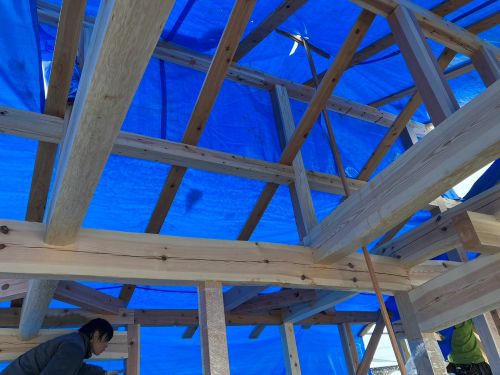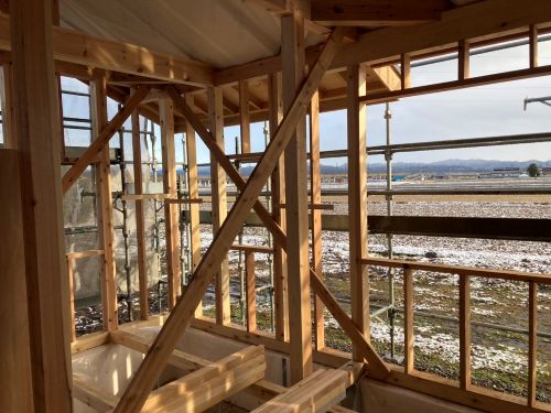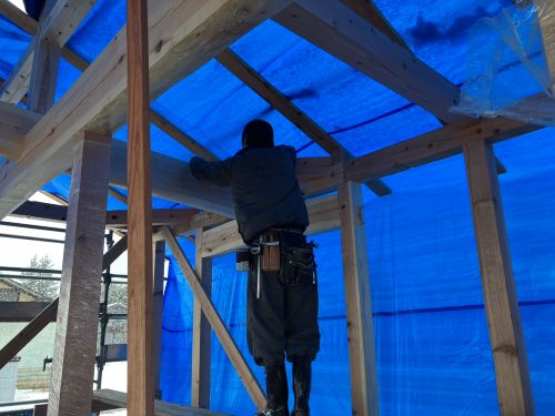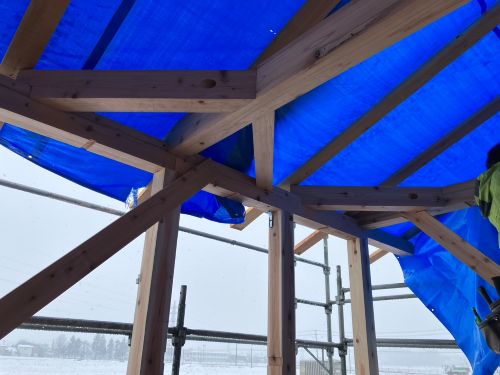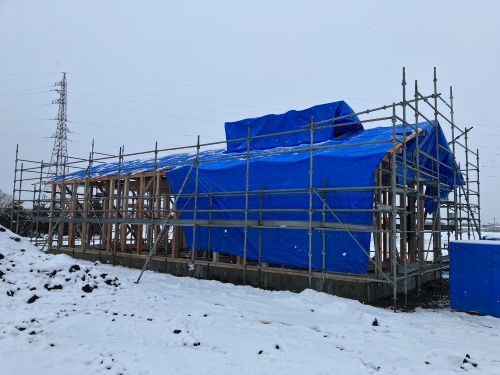 上棟した翌日は雪が降りました。シートを掛けて屋根下で出来る作業を進めています。構造金物取付や筋違いと間柱取り付けなどです。