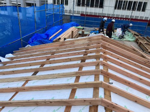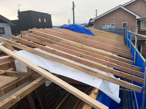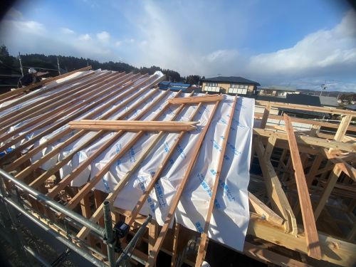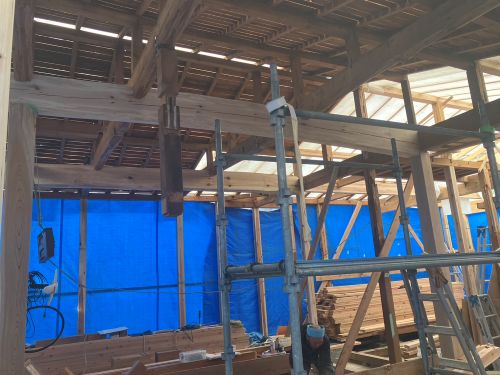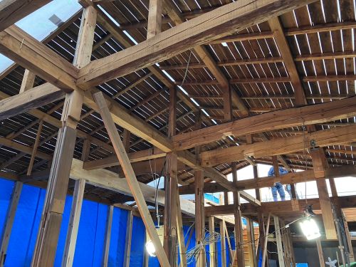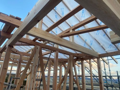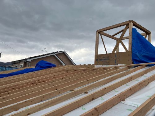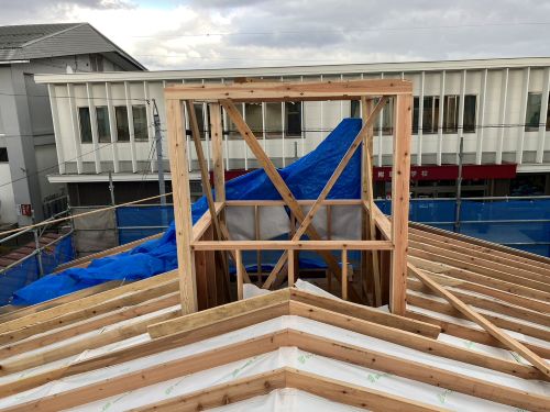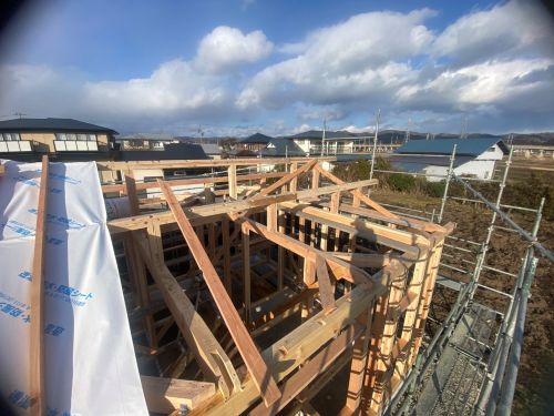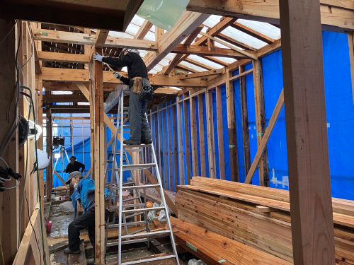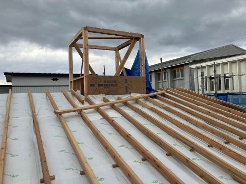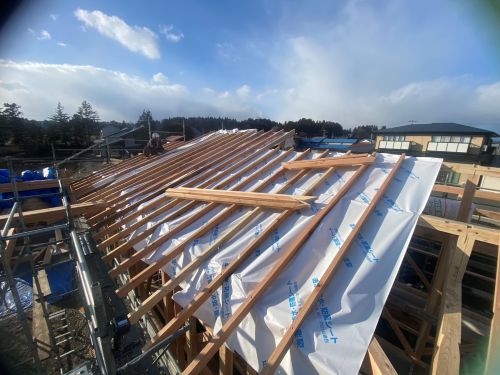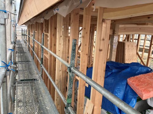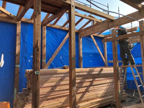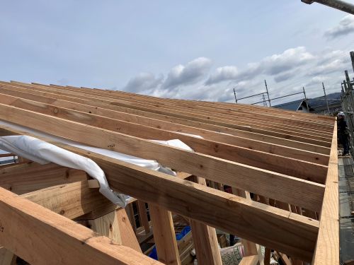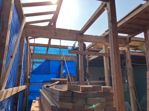 屋根垂木工事が進んでいます。外壁の間柱も取り付けが進んでいます。