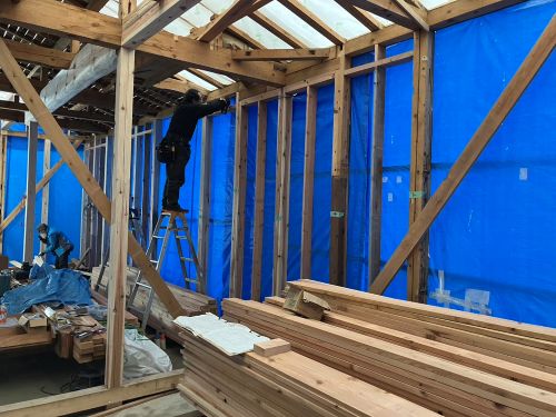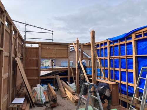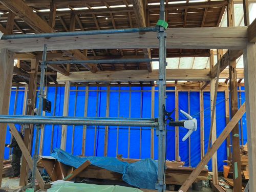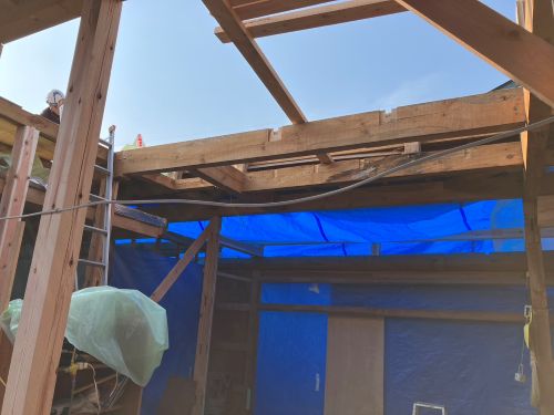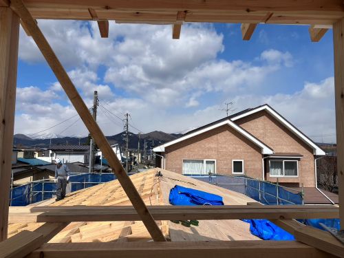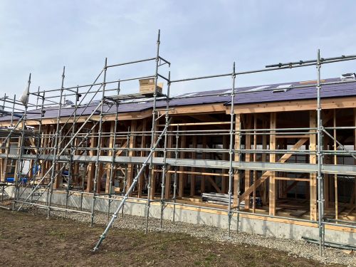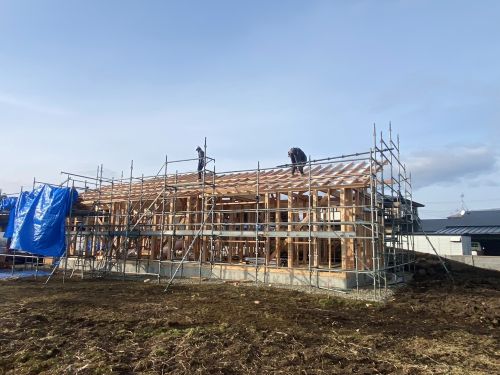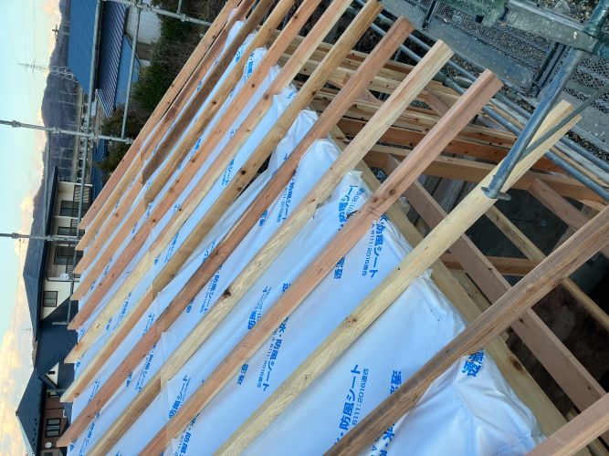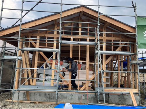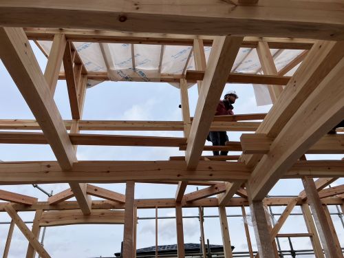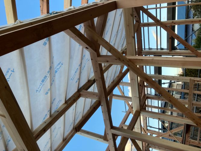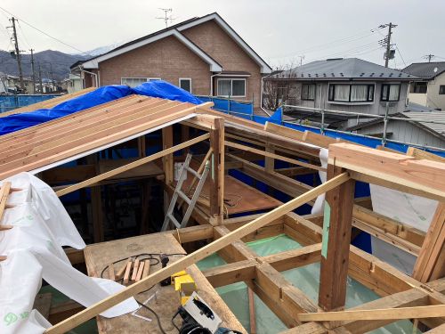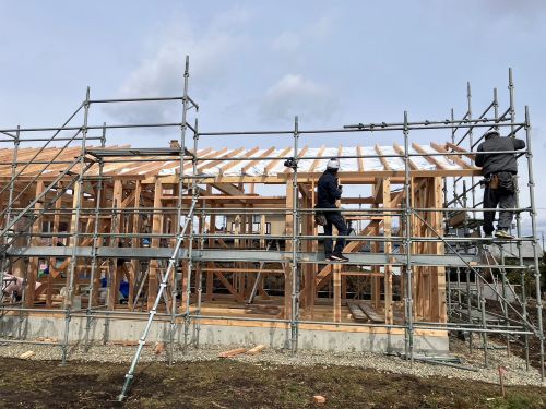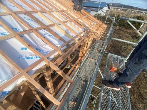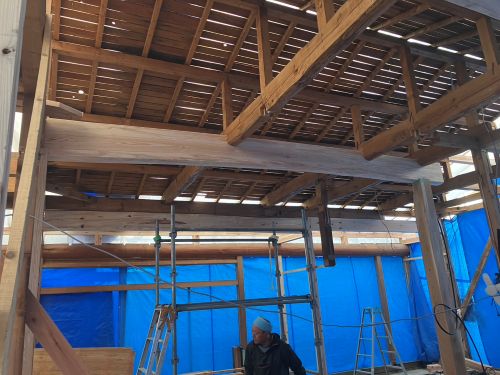 屋根垂木工事が進んでいます。外壁の間柱も取り付けが進んでいます。