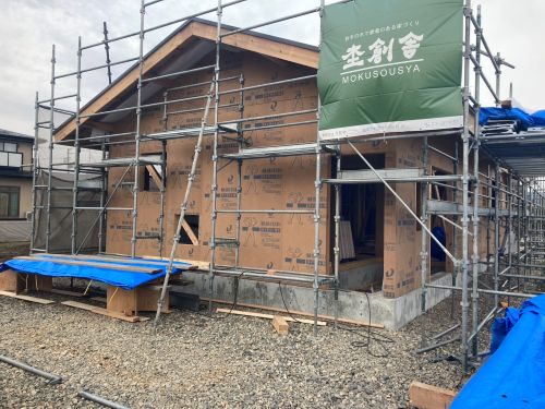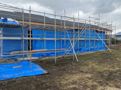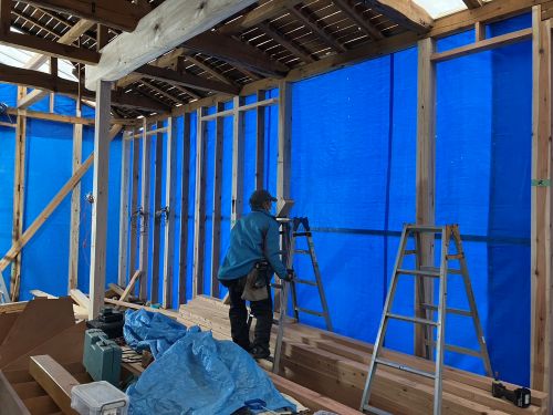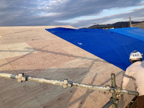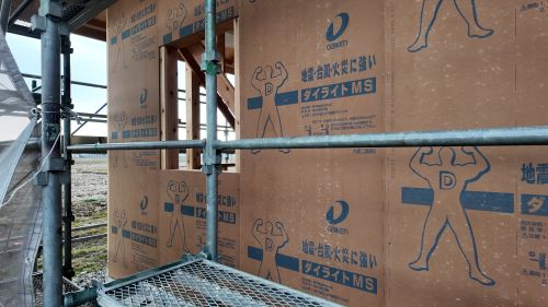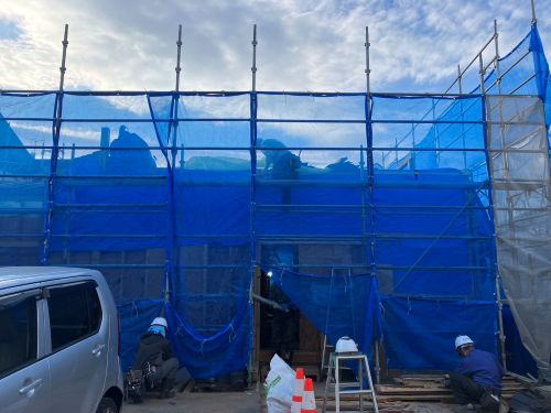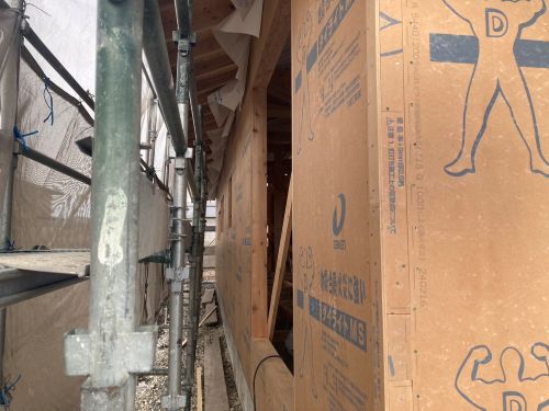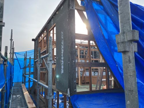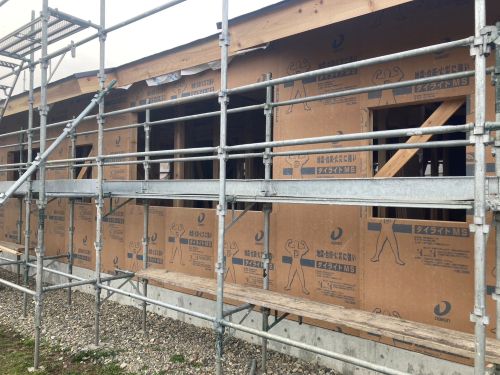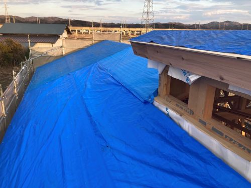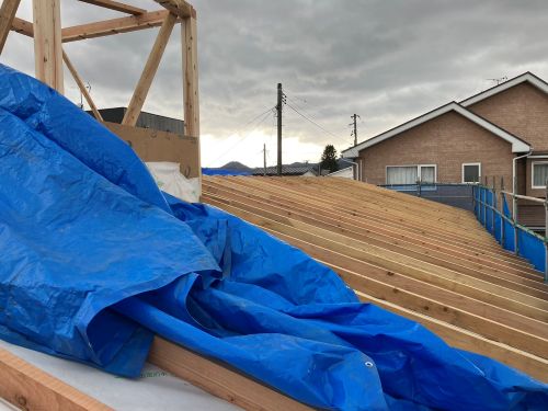 土曜日は外皮の構造面材の張り込みが進み現場養生を行って週末を向かえることが出来ました。