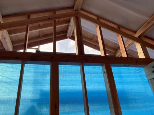 屋根垂木工事を進めております。屋根の中に小さな星見室も出来てきました。雨の日は外壁の間柱を進めます。