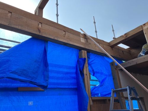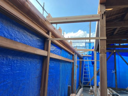 雨を避けての屋根垂木掛けと雨の時は間柱取り付けと天候に応じた工事が進んでおります。
