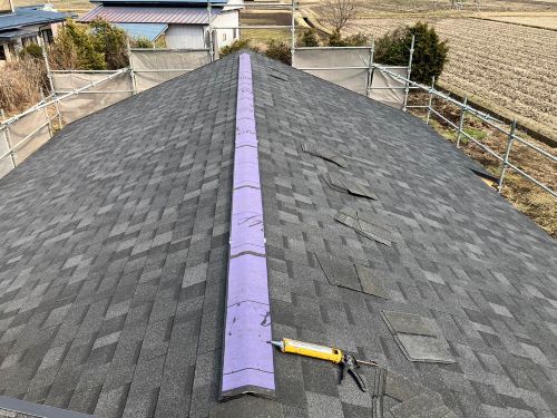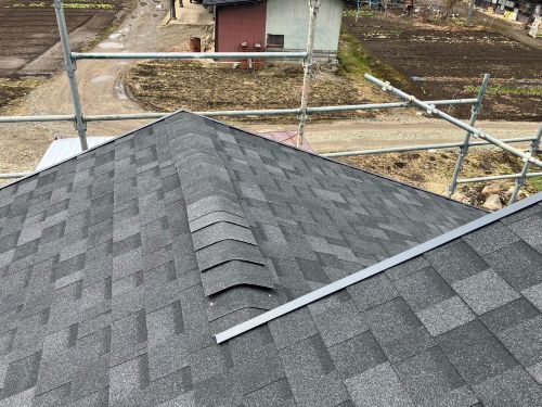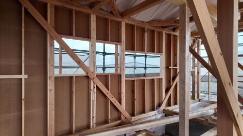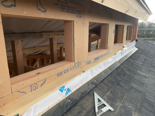 外壁間柱や外窓開口部下地が進みました。屋根の棟同材包も完了いたしました。