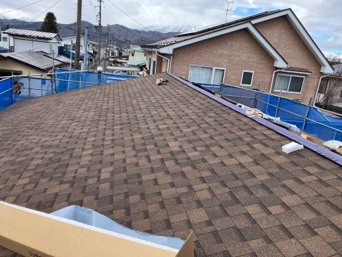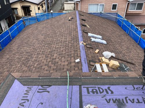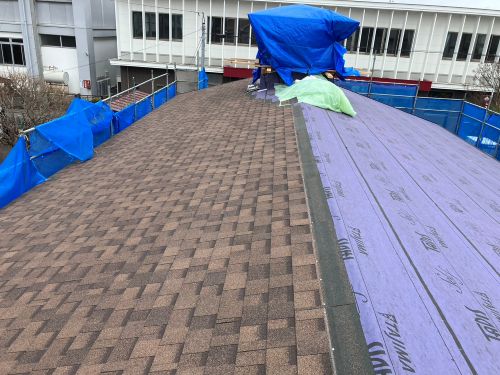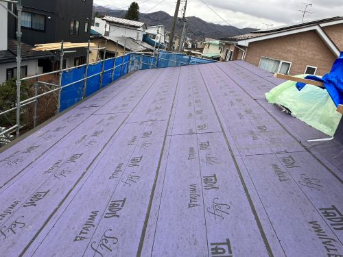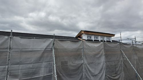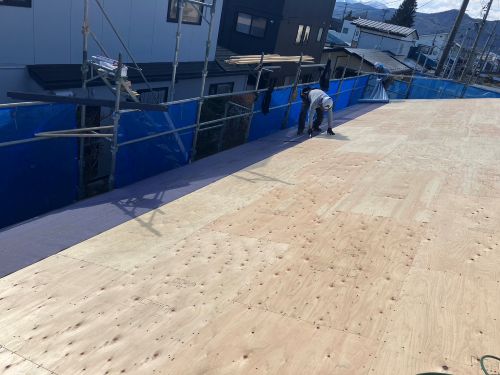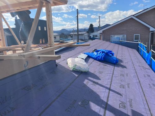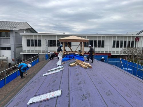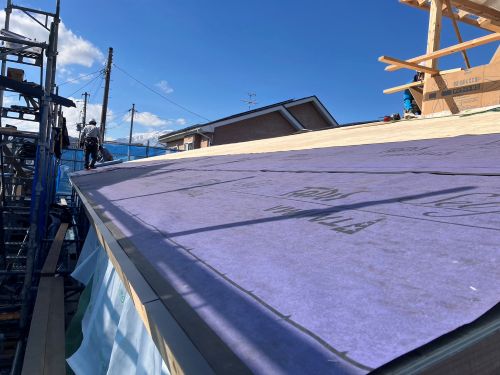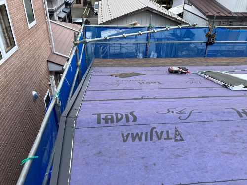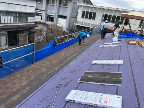 屋根には、ゴムアスシートが貼りこまれて板金の取り付けも進み、屋根葺きの準備が整い次第屋根葺きが始まります。