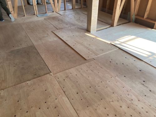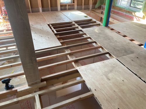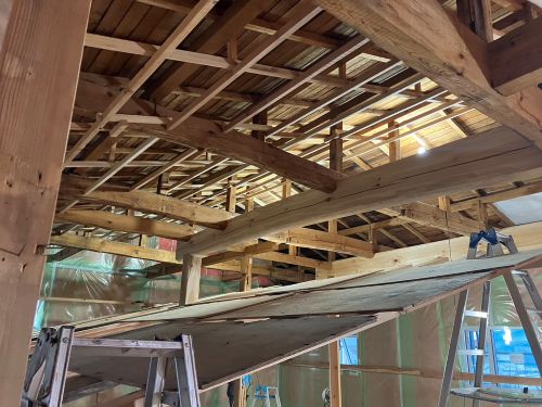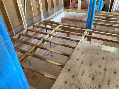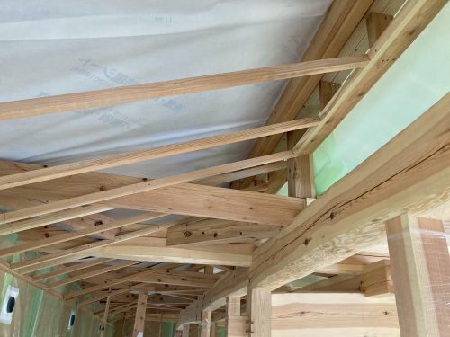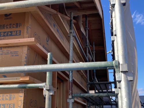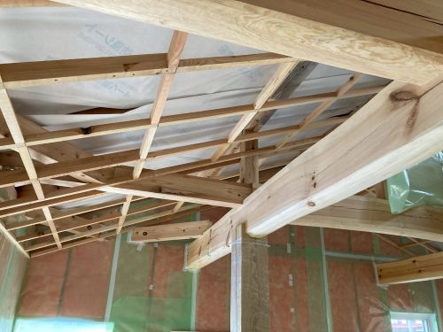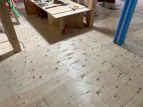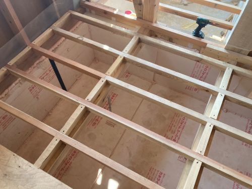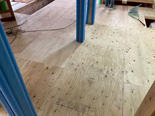 床根太の取り付けが完了して湯合板の敷き込み並べが進みました。外部は軒天井下地も完了です。