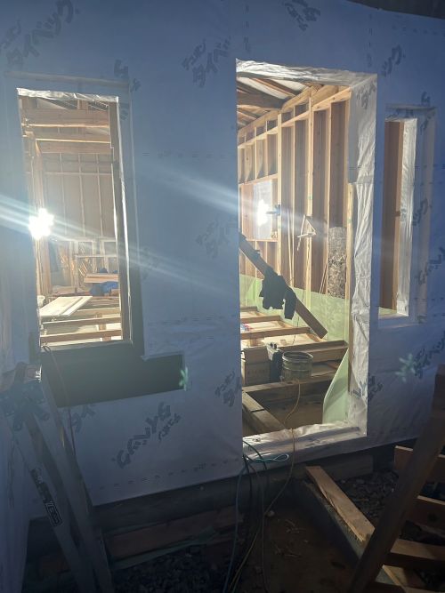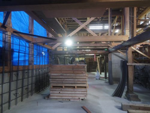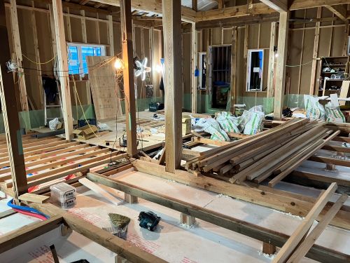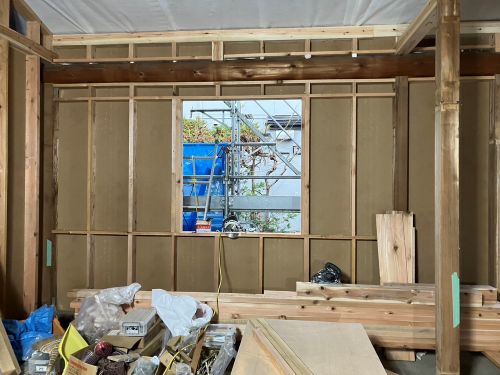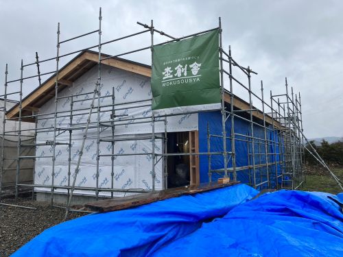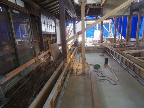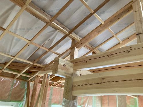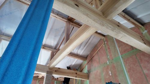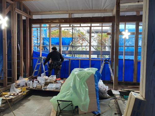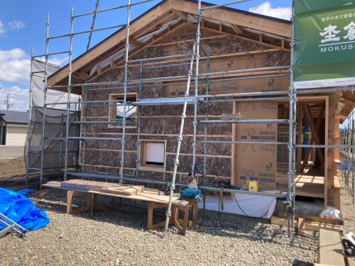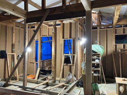 外部は外断熱が進んで内部は床の大引が進んでいます。