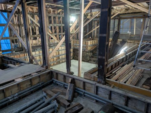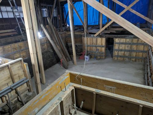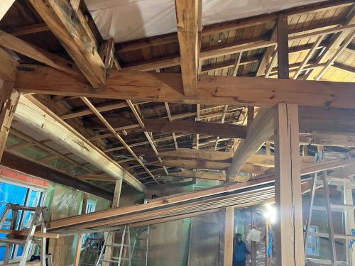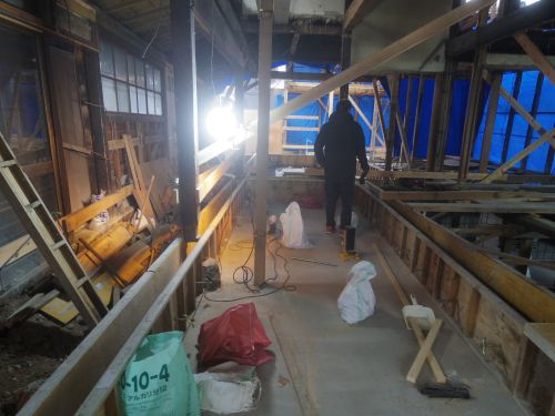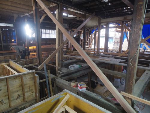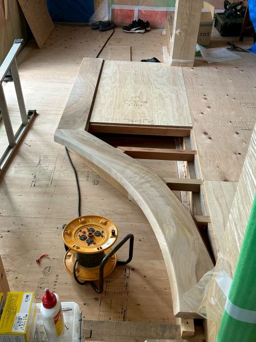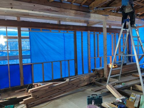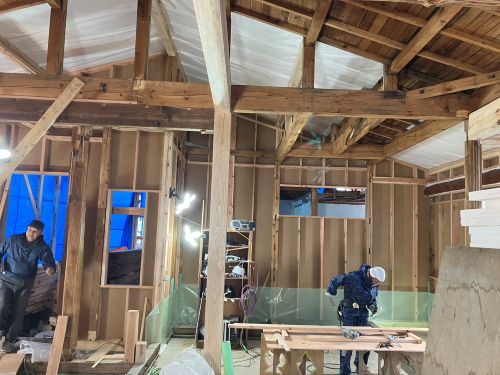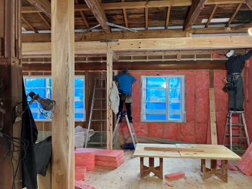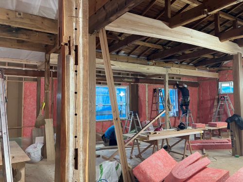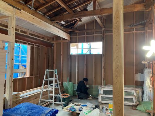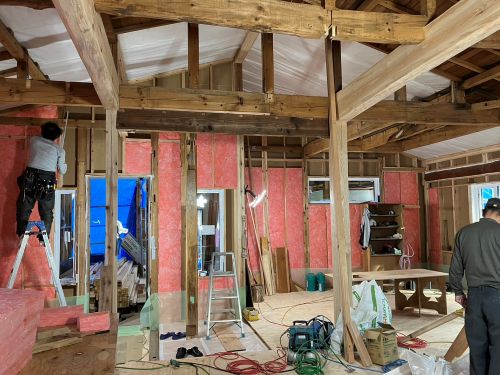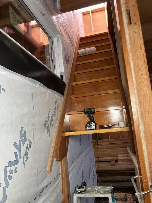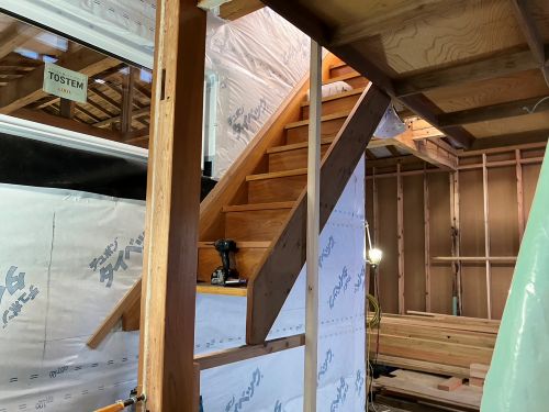 内断熱も充填されてきました。階段の取り付けも進めています。階段は既存建物にあった階段の再利用です。通常の解体工事だと壊して捨ててまた新たに買うのだと思いますが、使用場所に応じては古いものが役立つものです。