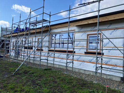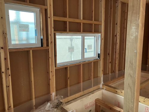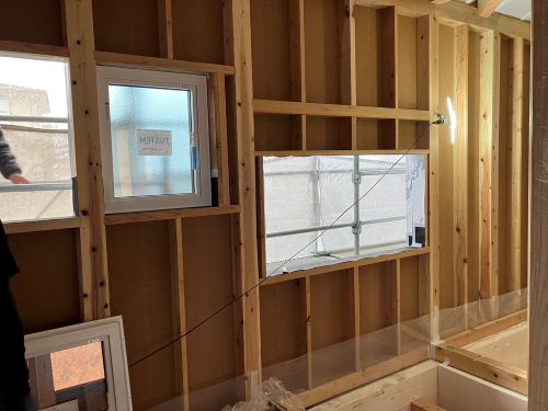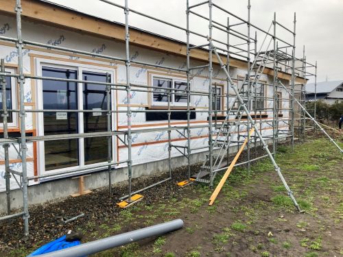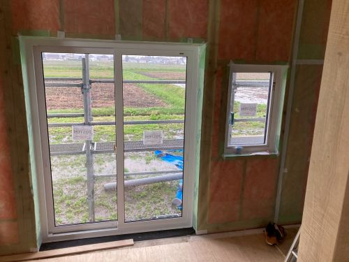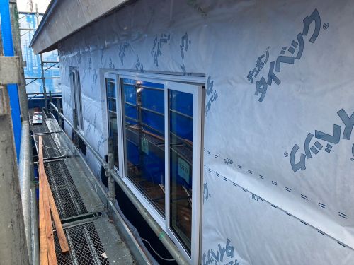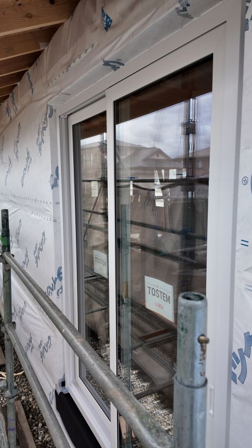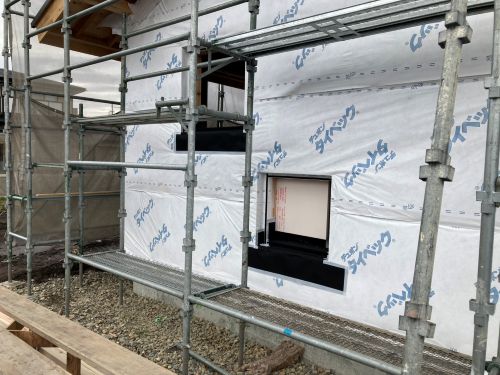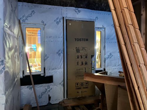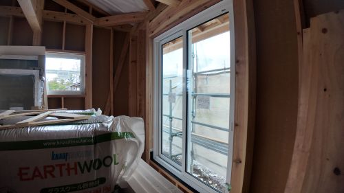 窓は全て取り付けられました。外壁の下地も進みました。内部は、土間断熱が進められていました。