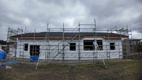 床根太取り付けが進みました。外部の外壁下地は完了です。