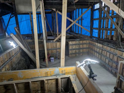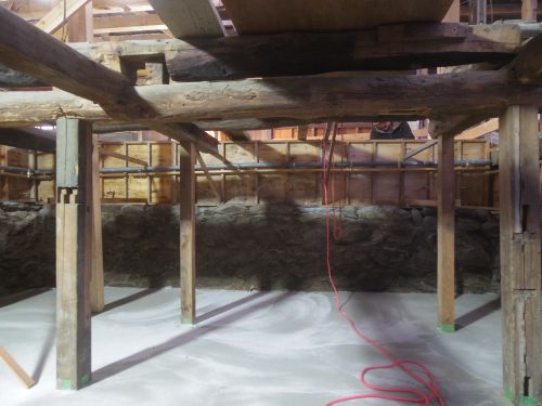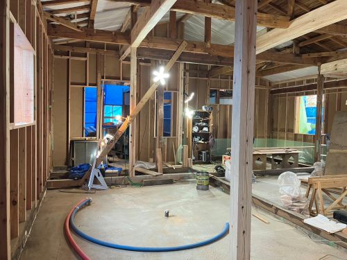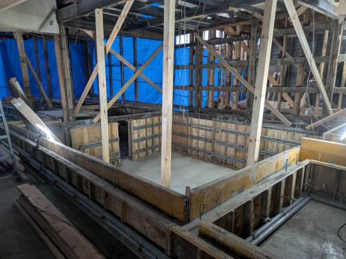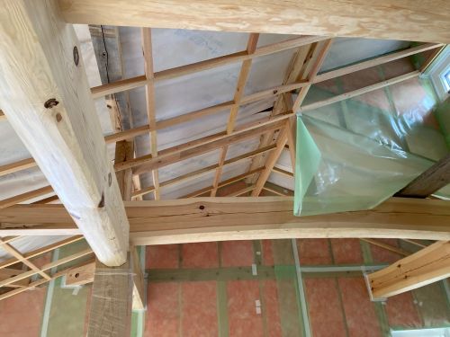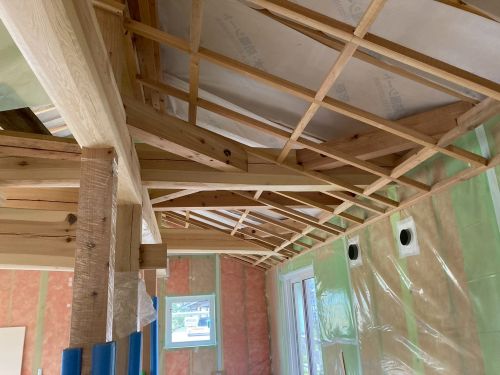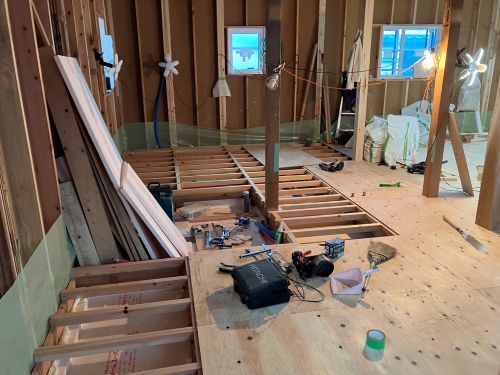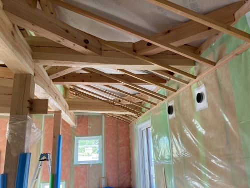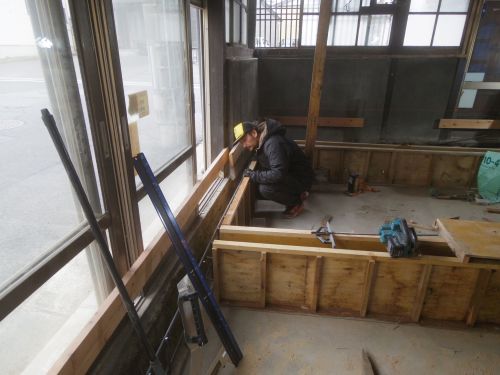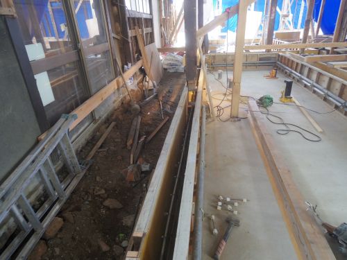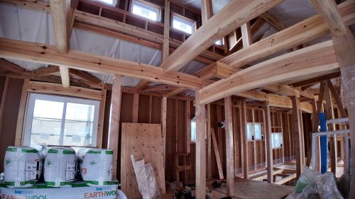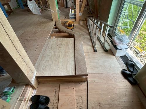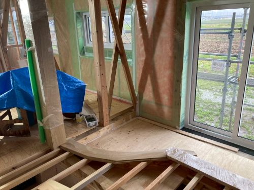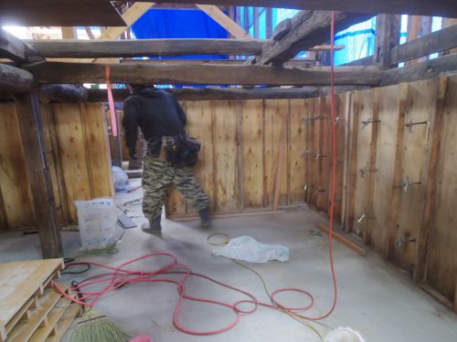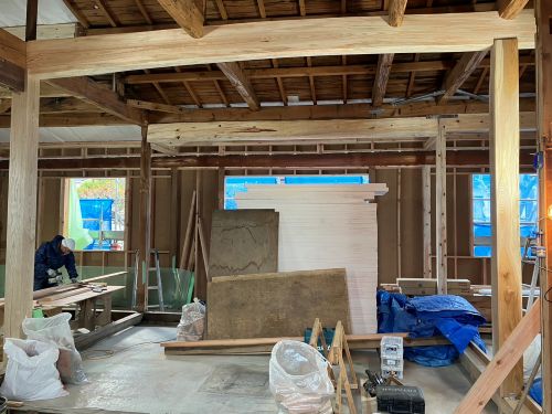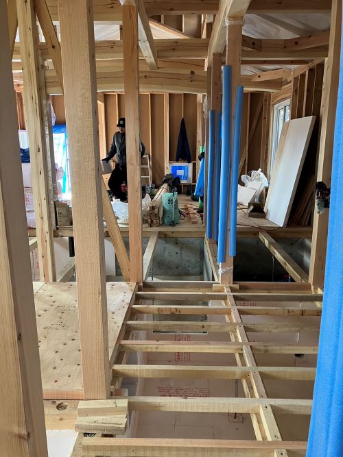 防湿シート張りも大方で、玄関框や小上がりの床組みも進みました。