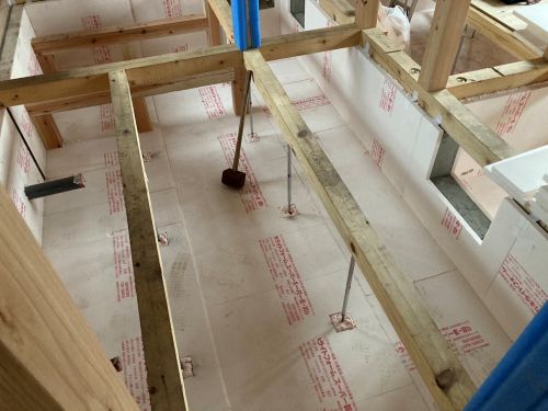 外断熱と透湿暴風シート張りが進み内部は床根太取り付けが進みました。