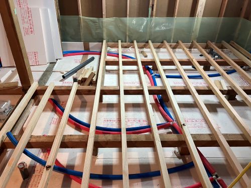 床下で水道配管が進み、充填断熱も進んで防湿シートの張り込みも進みました。