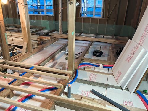 内断熱の充填も始まりました。水道配管も同時進行しています。