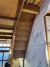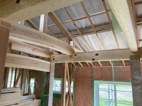 屋根葺き中ですが、雨も降るので、半分まで進めてから屋根下で濡れずに出来る間柱の取り付けを進めています。