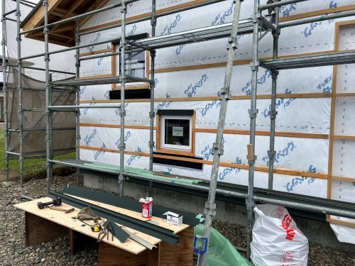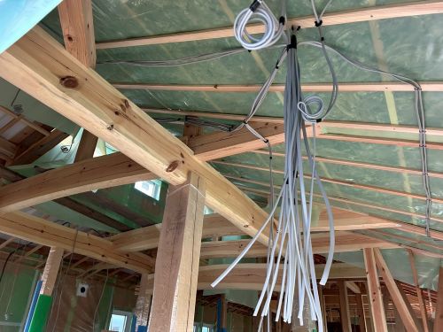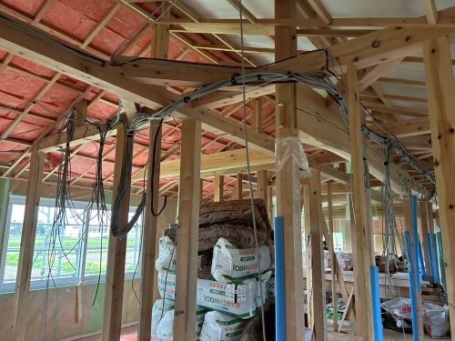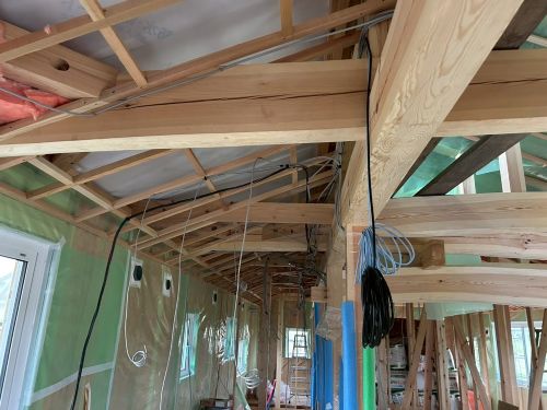 天井断熱が進み電気配線も行われました。外部は水切り板金も進めました。