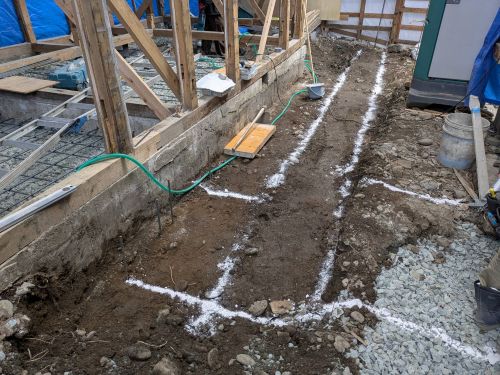 気密検査を行いました。玄関ドアがまだついていないこともあって結果は0.34cm/㎡です。車庫基礎の捨てコン打設も進みました。