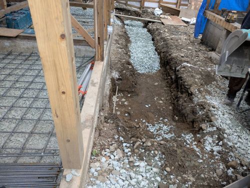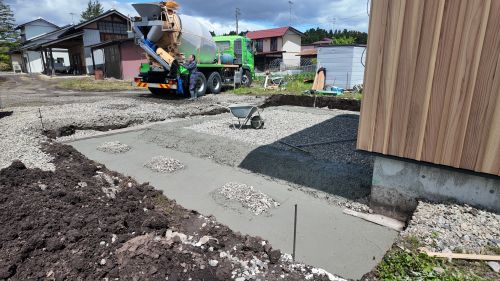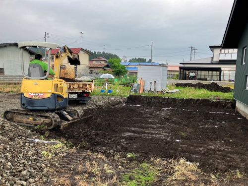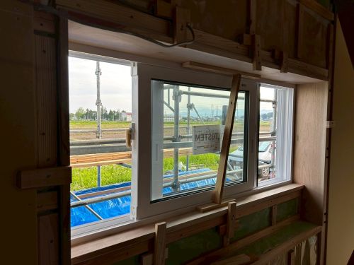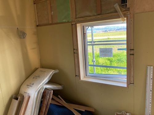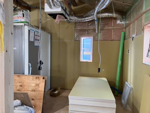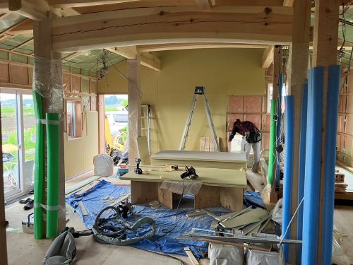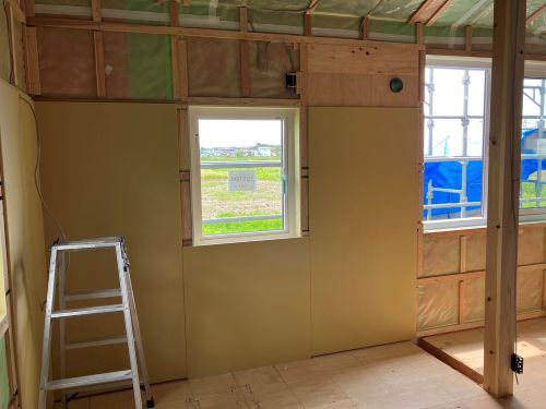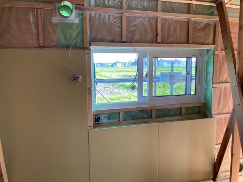 雨ですが、止むのを待って車庫基礎工事が始まりました。内部のPB張り込みはもう一息で完了です。UBも設置が進んで家の雰囲気が出来てきました。窓周りの造作枠も進み始めました。