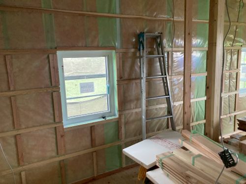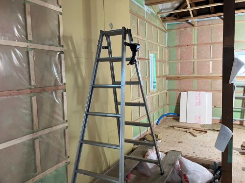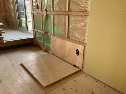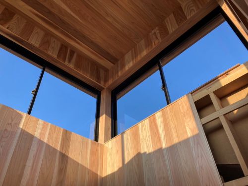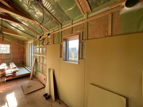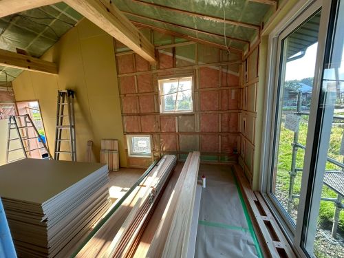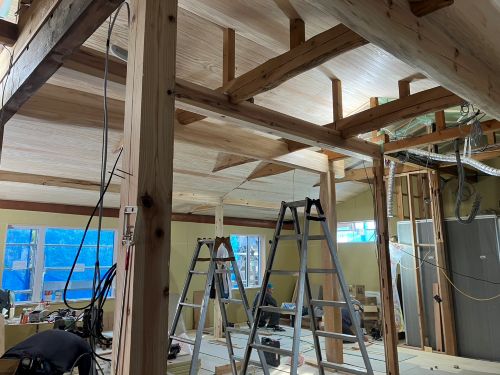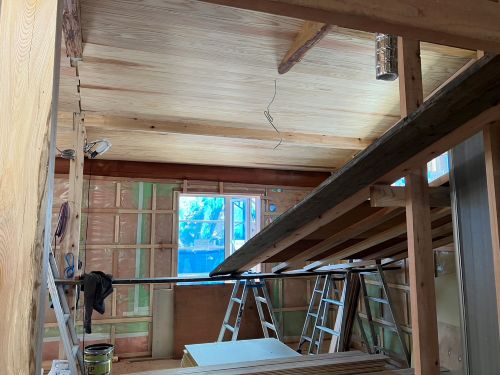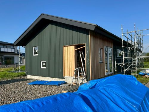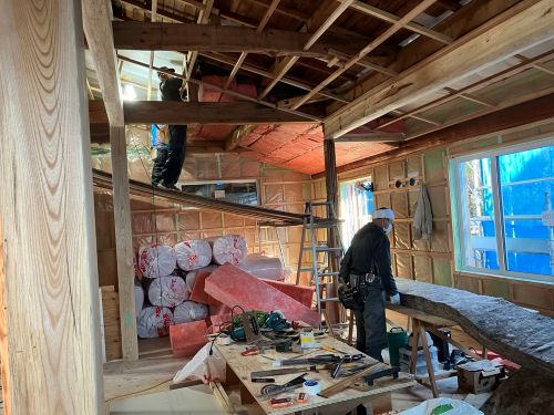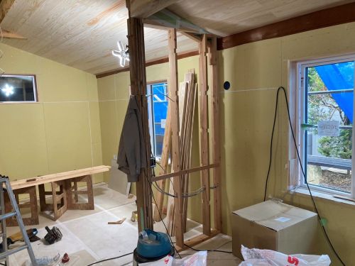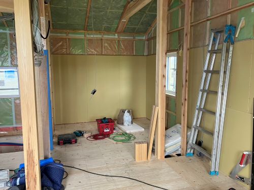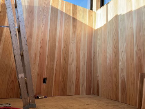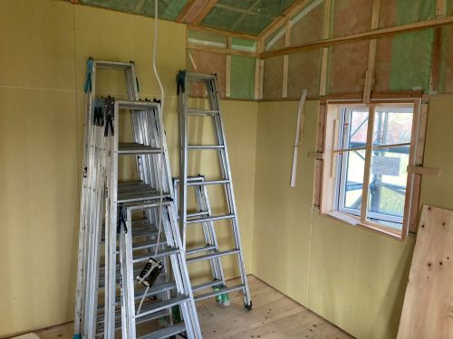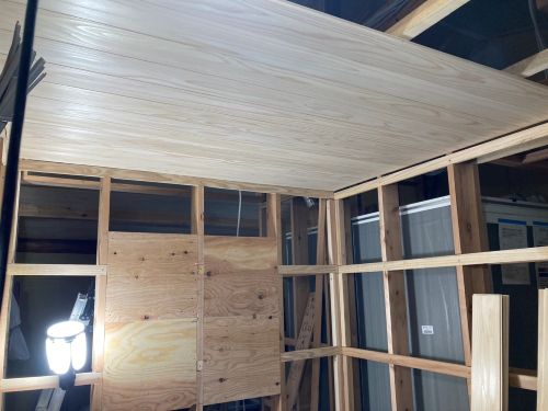 床張り上げて間仕切り壁工事が始まりました。星見室のガルバも貼り込まれていいかんじになってきました。