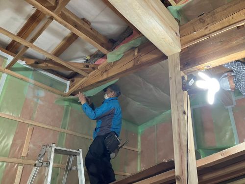 天井断熱部の防湿シート張り込みを進めました。