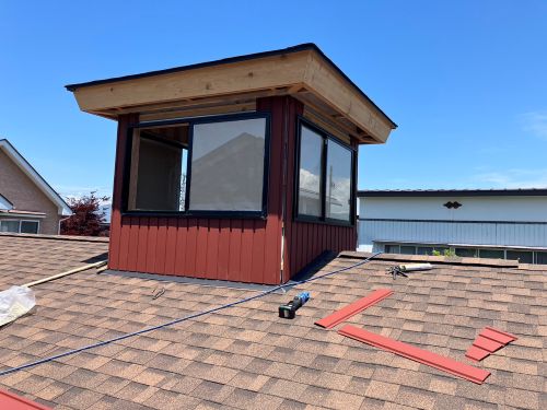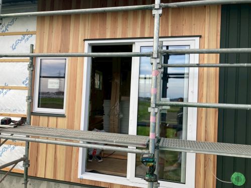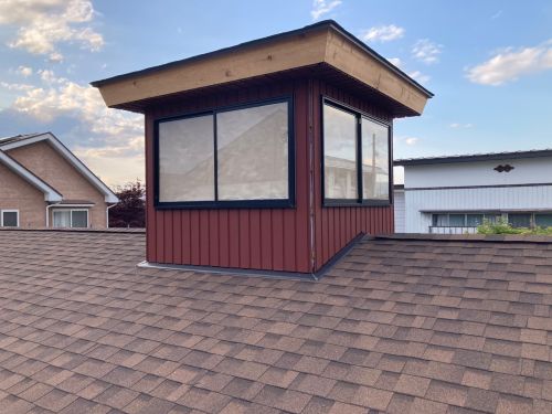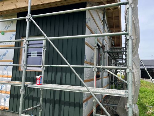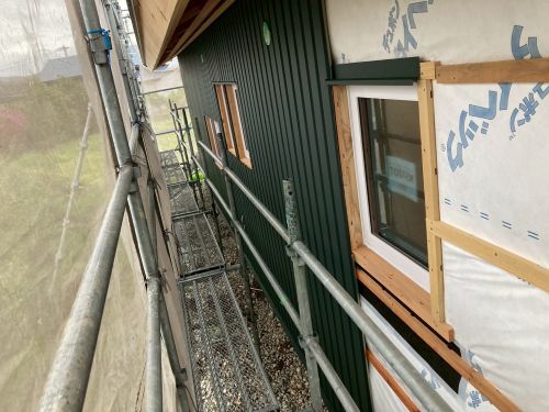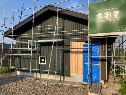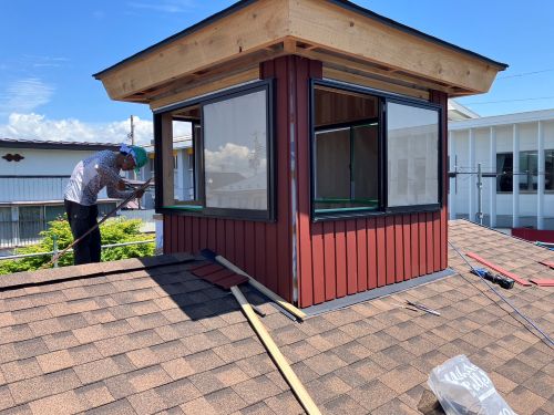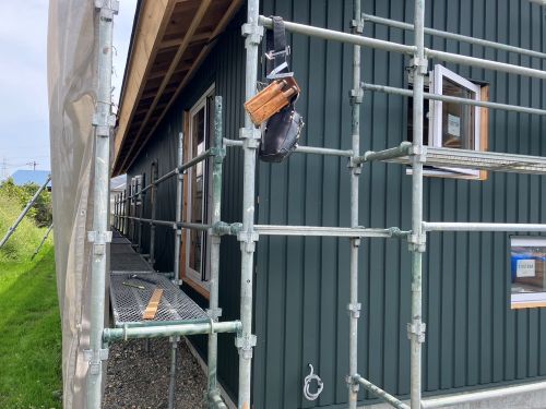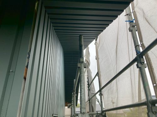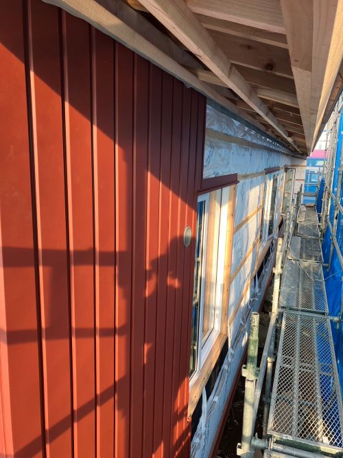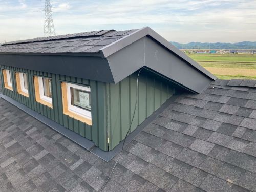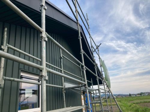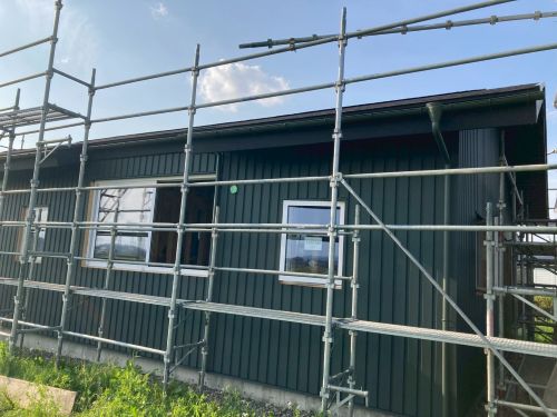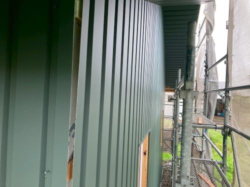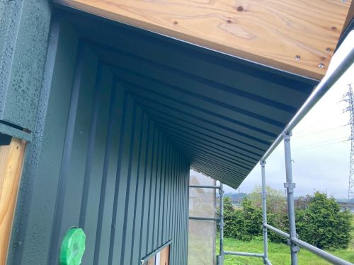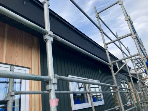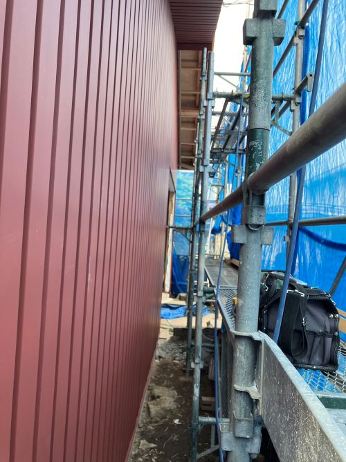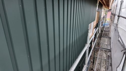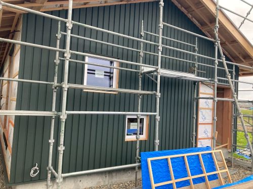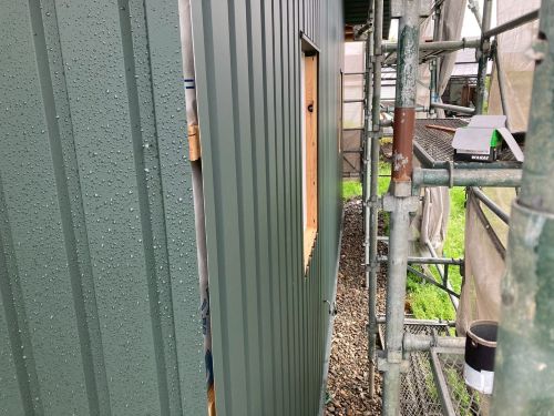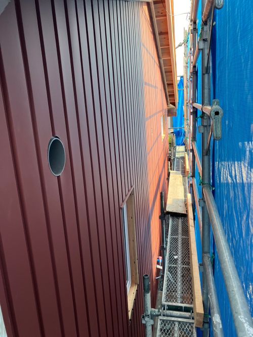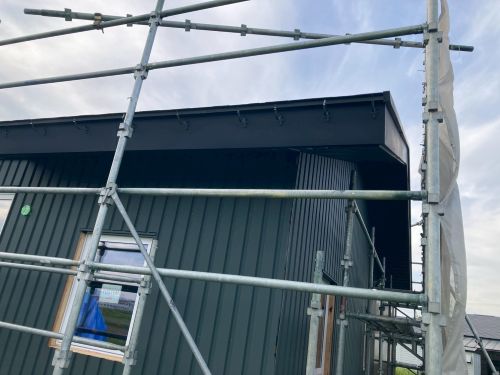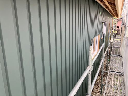 外壁を張り上げて破風板金も取り付けられてきました。後は、角部や窓周りの役物の板金を加工して取り付ければ完了です。