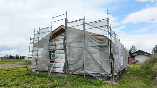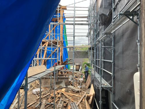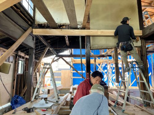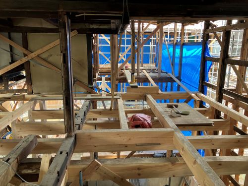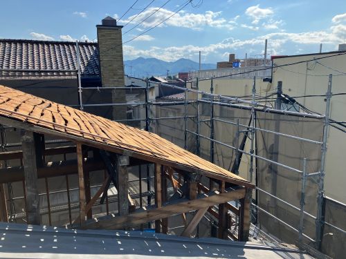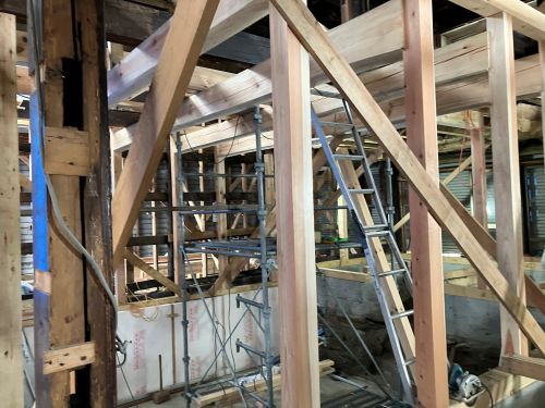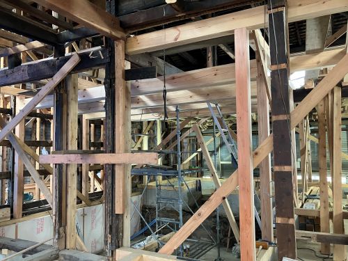 木組みの構造補強も進み、外部には足場も掛けこまれました。