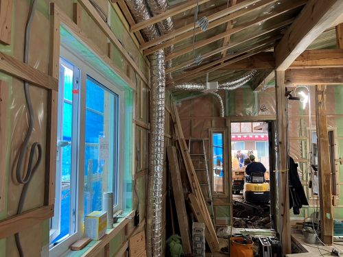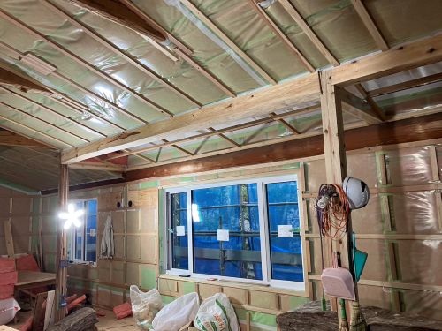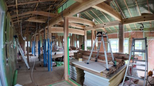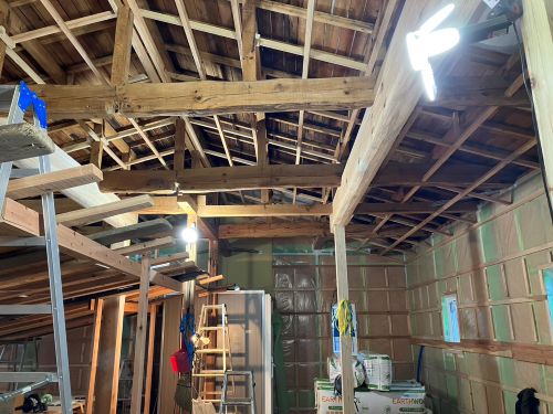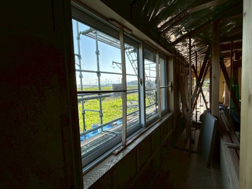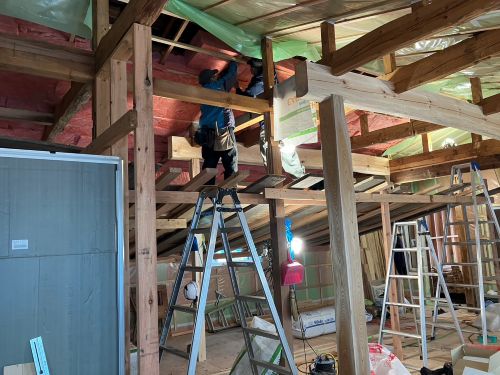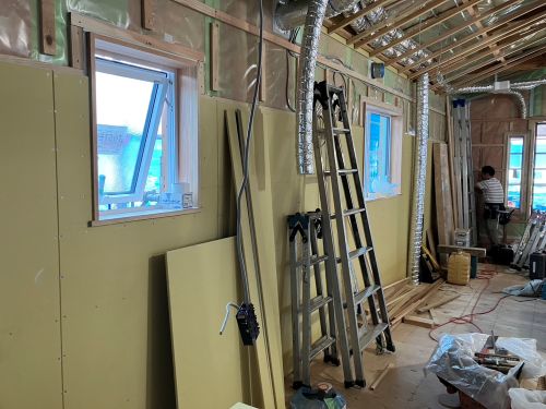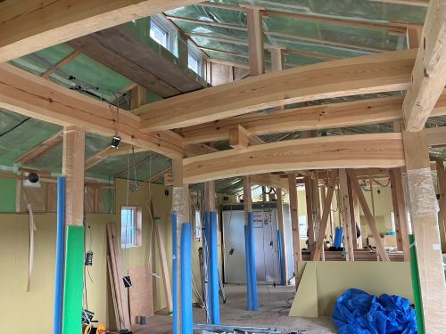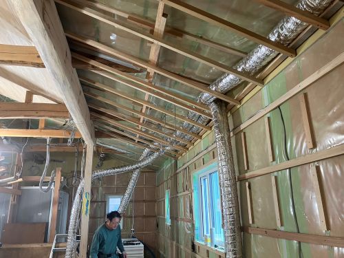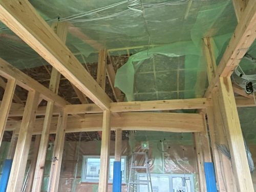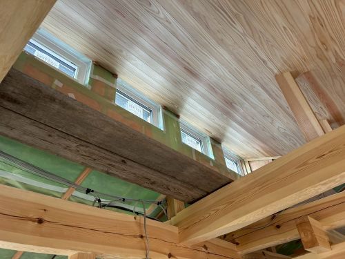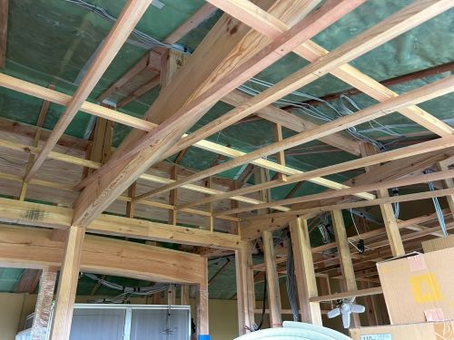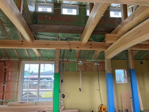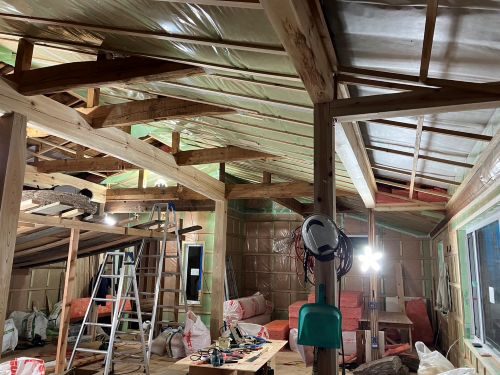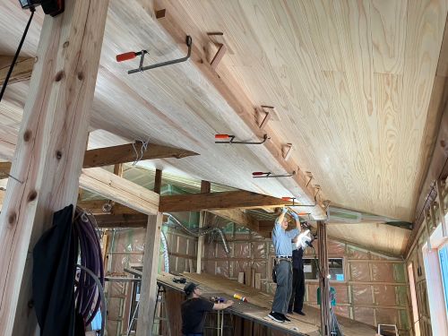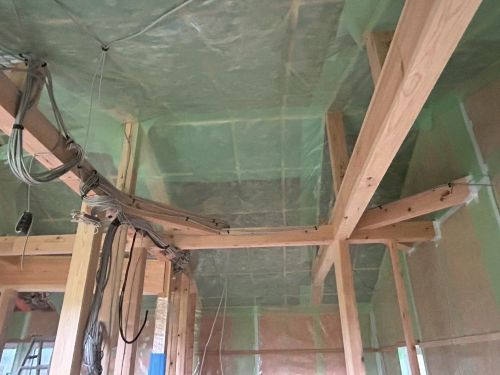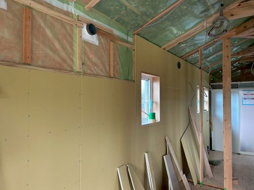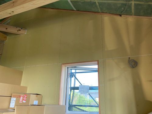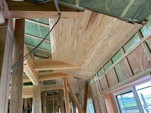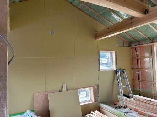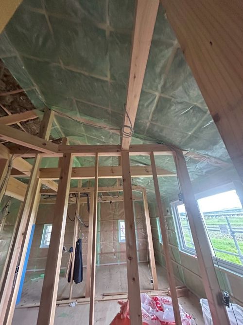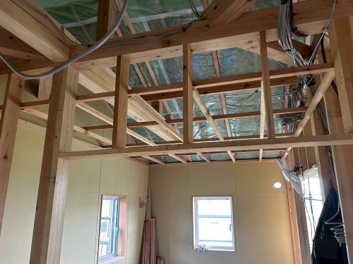 斜め天井板が張り上げられて、外皮側PB張り込みが進んでいます。