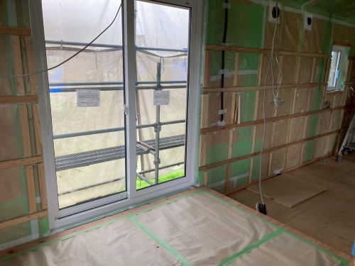 外壁工事が進む現場の内部では、外周部外皮側の石膏ボード張り込みが進んでいました。