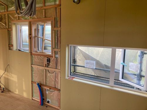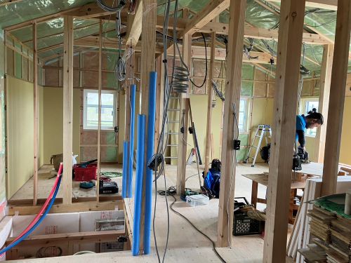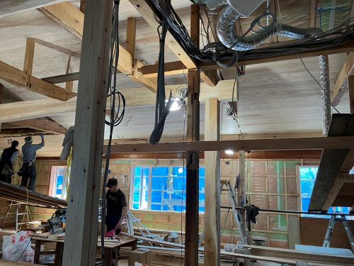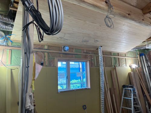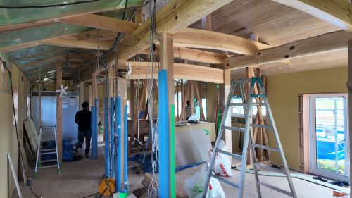 外壁は大方張り進んで、軒天井のガルバリウム鋼板梁へと工事は移行しています。内部は壁PB張り下地が進められて電気配線も所定位置へ取り付けられてきました。