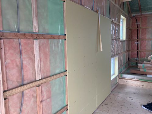 外壁が相上がるところ、中の方では外皮防火構造のPB張り込みが進んでいます。