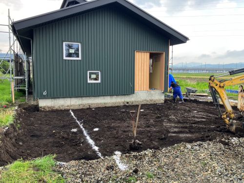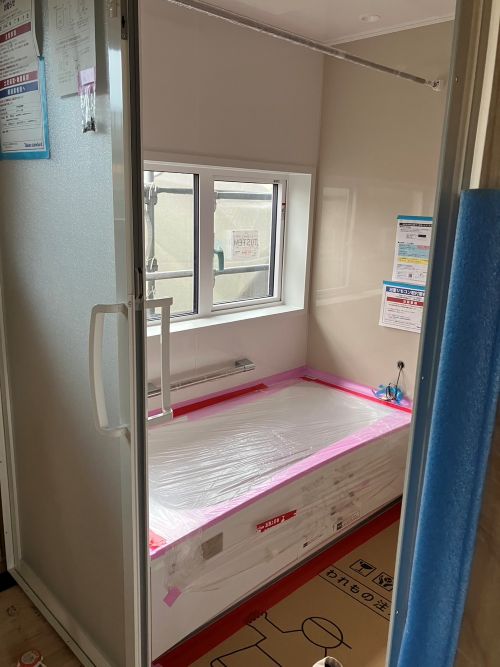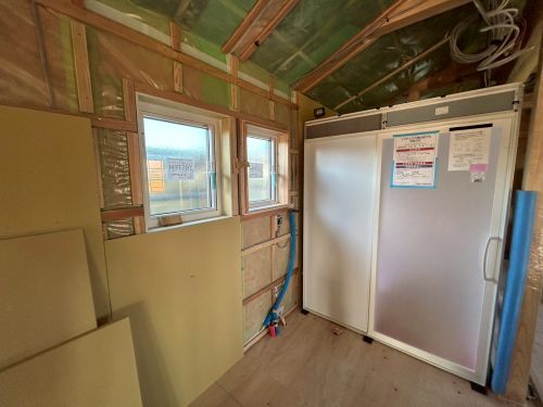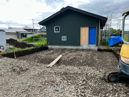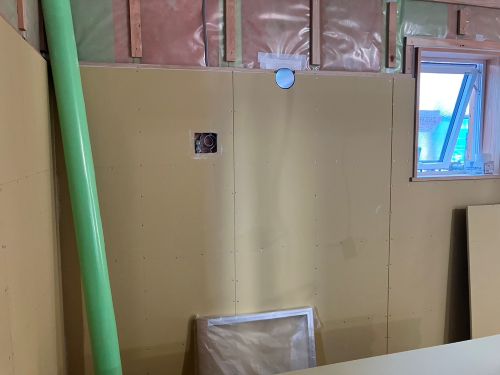 ユニットバスも取付完了してPB張り込みが引き続き進んでいます。外部は車庫基礎の為に絡む足場を一部外して準備していますが、今日は雨なのでまだ取りかかれませんね。