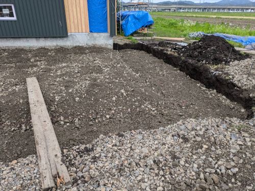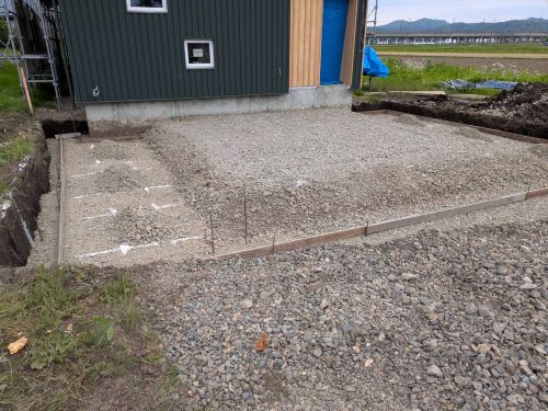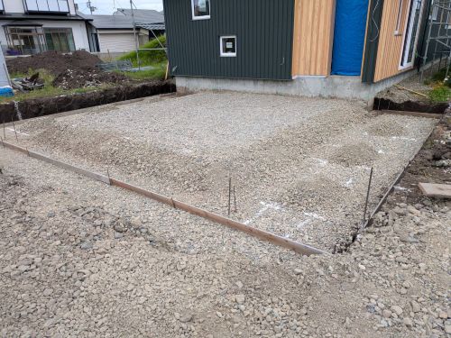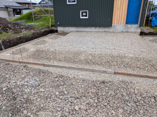 車庫基礎の砕石値業が進みました。斜め天井板張りも進んでいました。