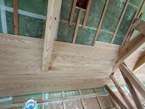 玄関ポーチの配筋が進み、斜め天井の杉板張りも進んで、外皮の防火構造部となるPB張り込みも進んでいます。