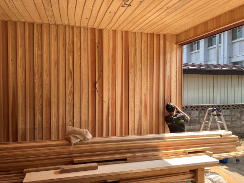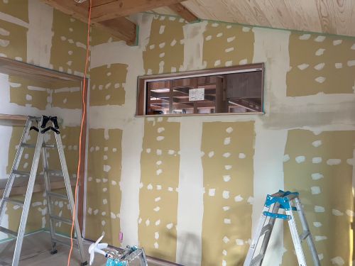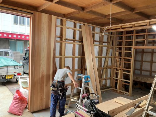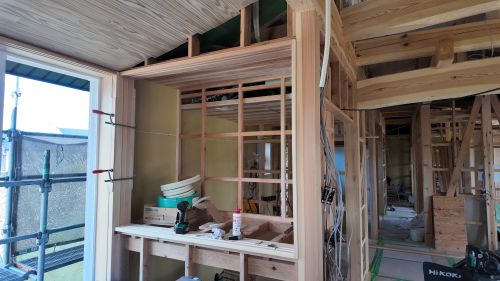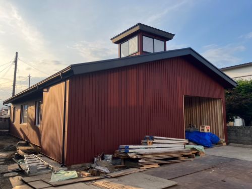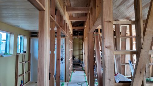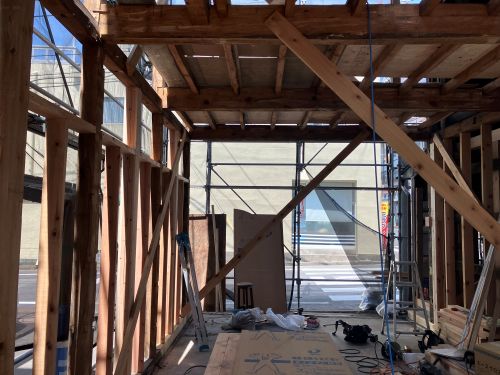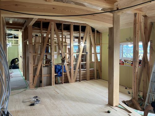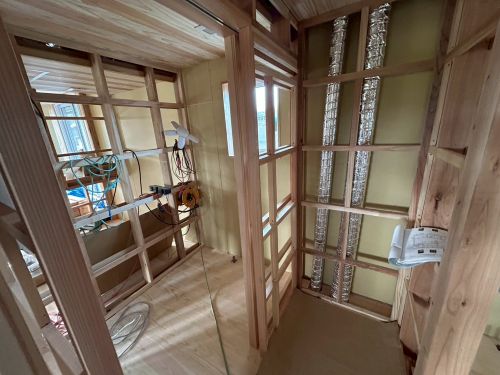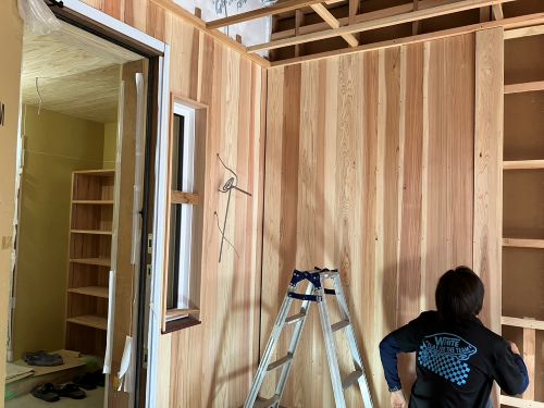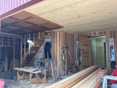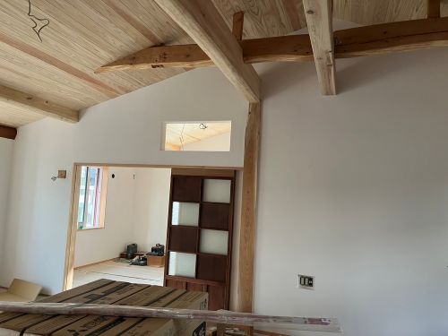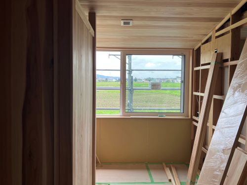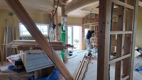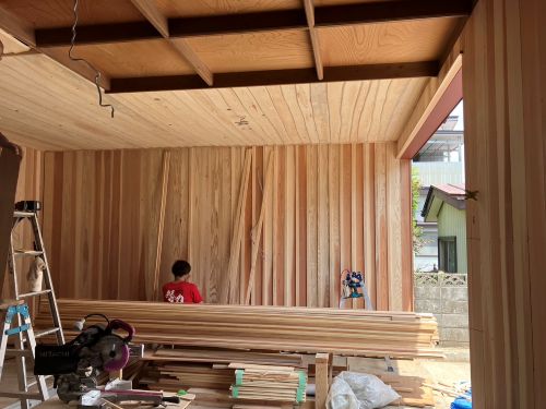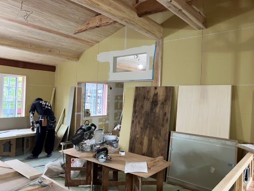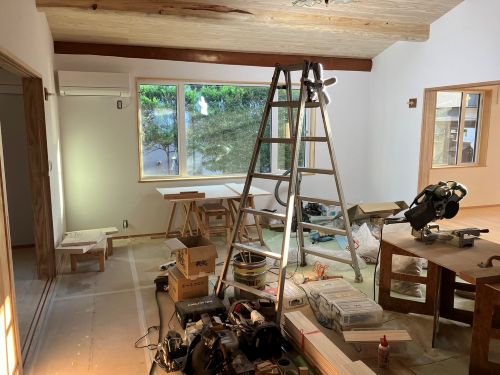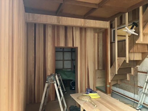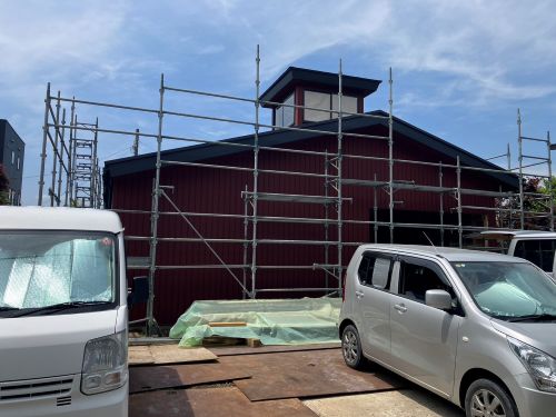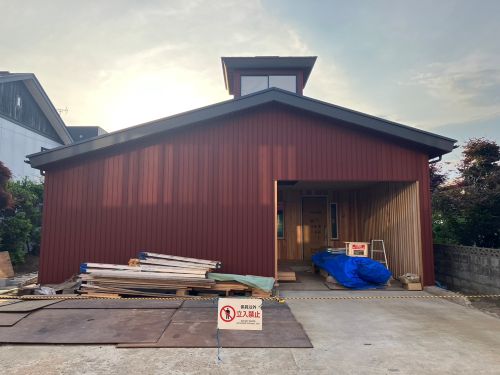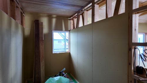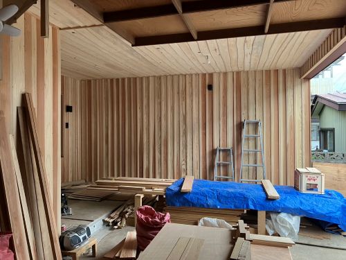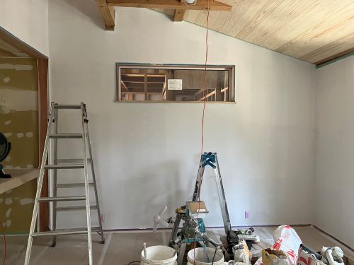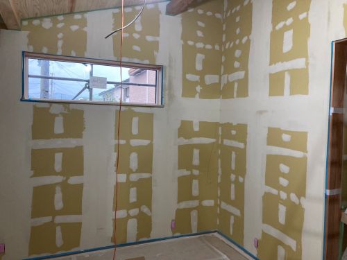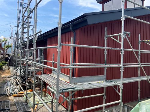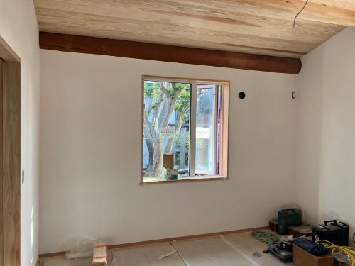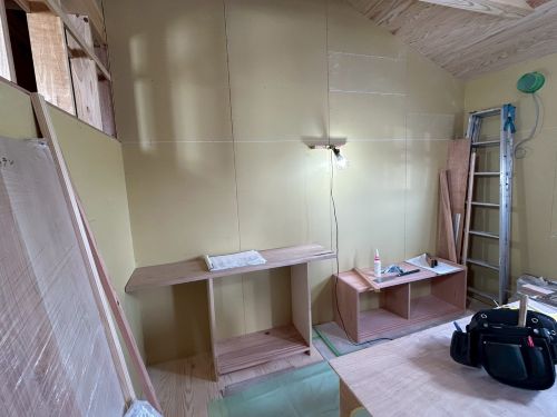 内装はパテ打ち後の下塗りも進んで一部壁が白くなりました。外壁は赤です。大工造作も同時進行しています。