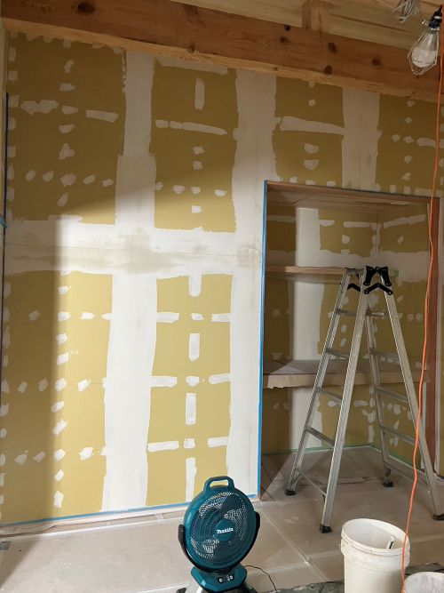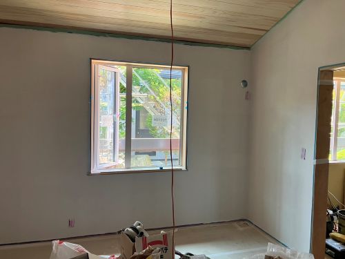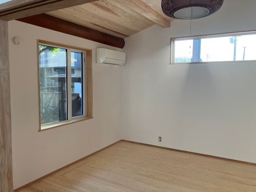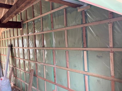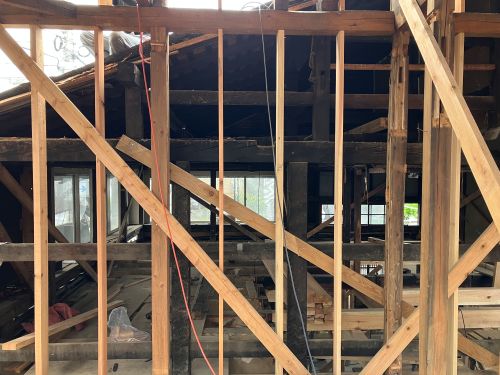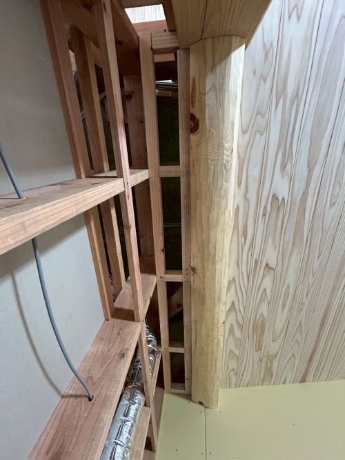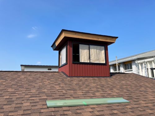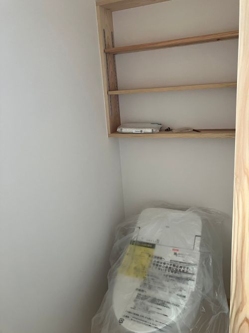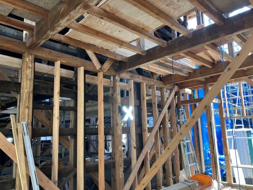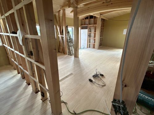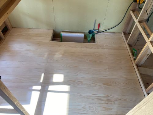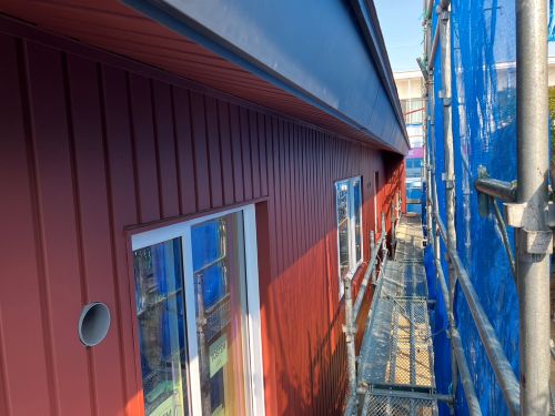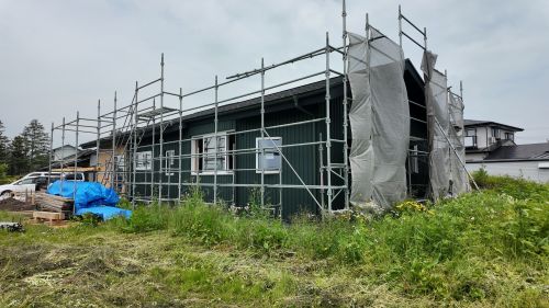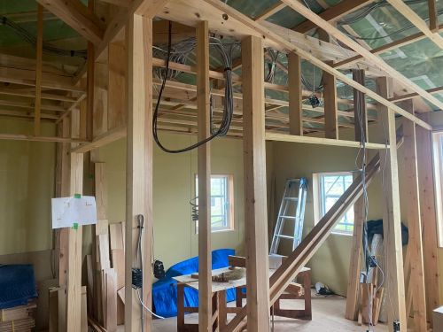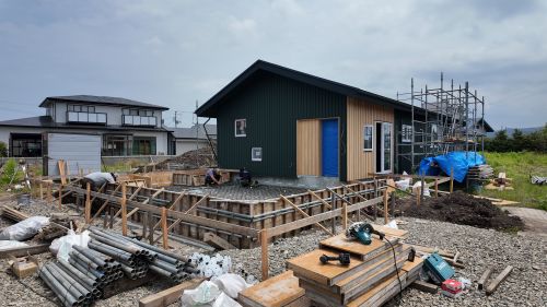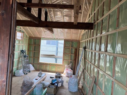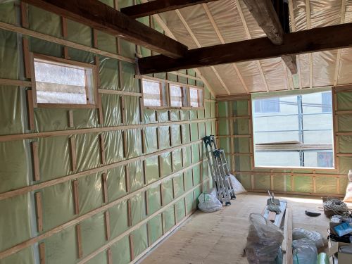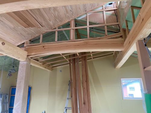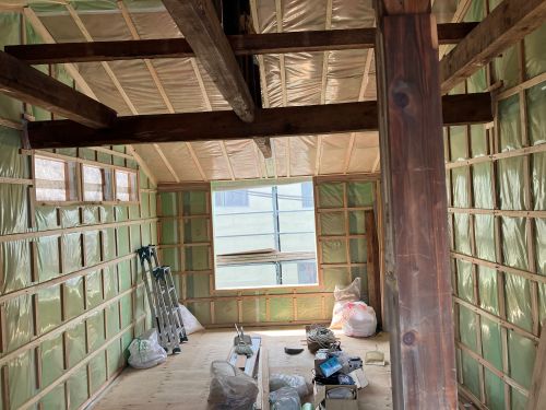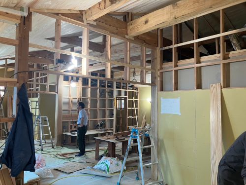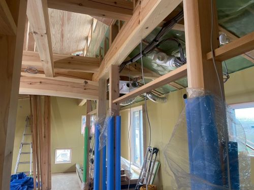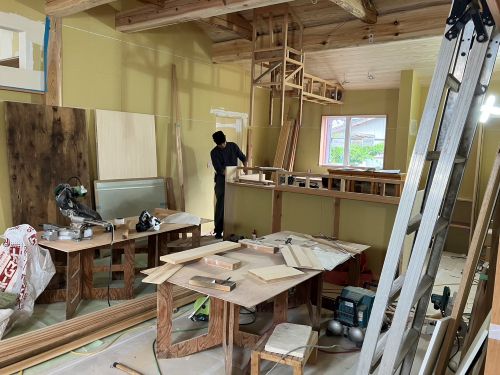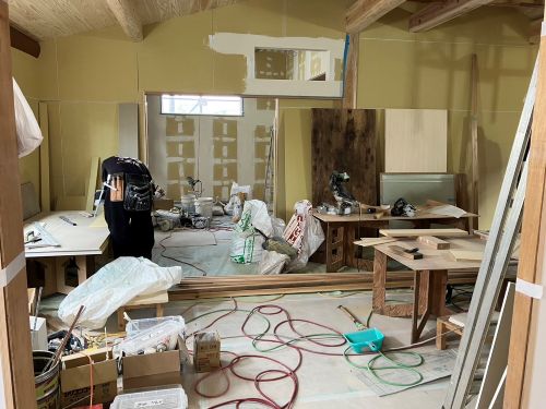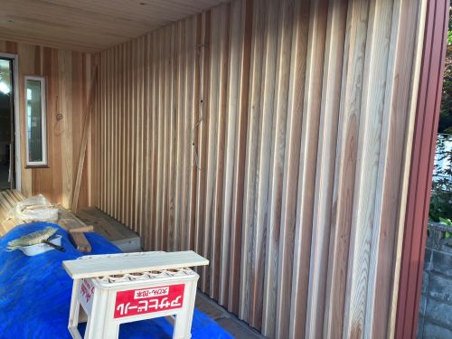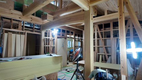 内装はパテ打ち後の下塗りも進んで一部壁が白くなりました。外壁は赤です。大工造作も同時進行しています。