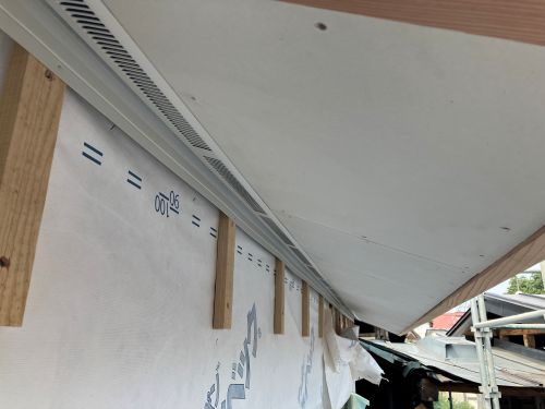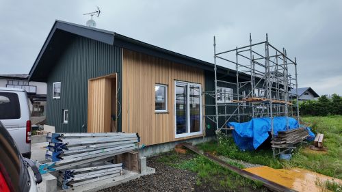 外部玄関先の外壁工事が進みました、内部の造作工事も進行中です。