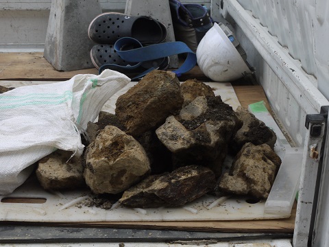 今朝の杢創舎日記で書いた積み込んだ石がこれらです。片手で持てる物は片手で持ちながらビッコ足で運び、もてない思い石は袋に入れて肩で運びました。ウン!やれば出来る!