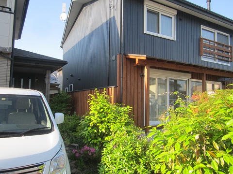 春完成の本宮の新築工事で、ご契約時のサービス板塀を北側の追加分と含めて取り付けさせていただきました。傘木部には自社板金加工した板金笠木を取り付けて腐食対策です。本体は経板張りに超撥水剤を塗布しての腐食対策です。お隣の緑が借景になりました。