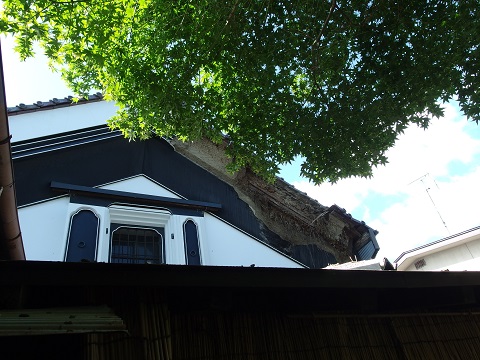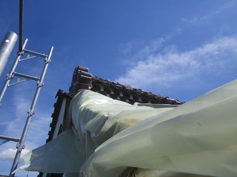 雨が降る時期なので、養生は欠かせません、青空に伸び上がるような切り妻の先端が印象的な現場です。
