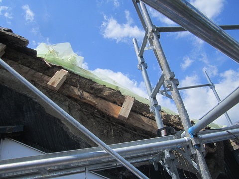 足場を組んで土が崩れた部分の補強と下地を組んで、瓦屋さんと左官屋さんの出番待ちです。