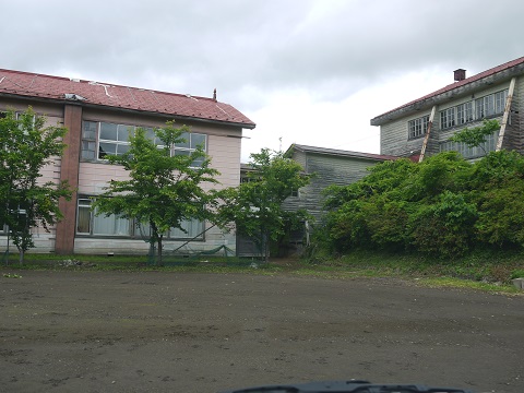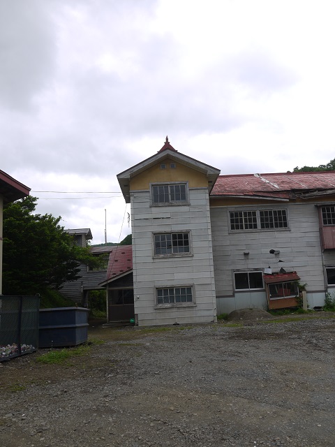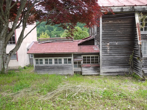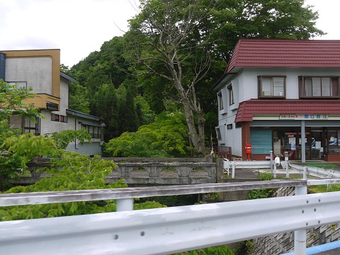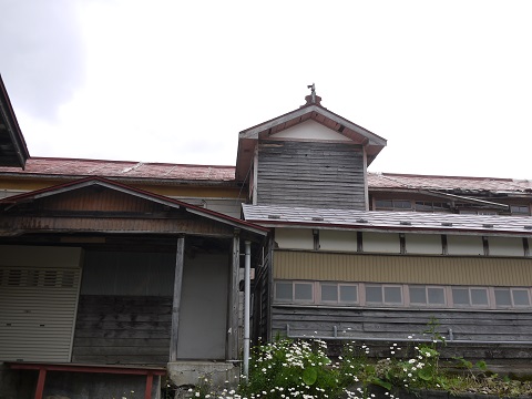 現場便りの趣旨からずれてしまいますが、懐かしい木造校舎の写真を紹介させていただきます。ここは、その廃校前の商店街と橋です。温泉地の様な風情があって、映画のロケチにも出来そうです。