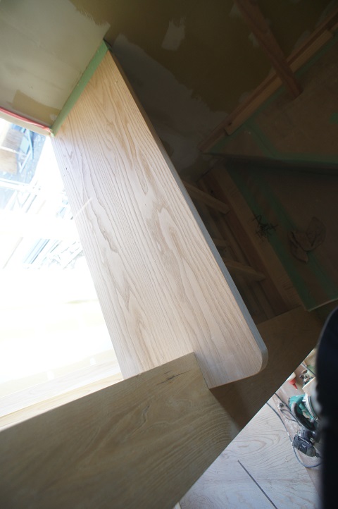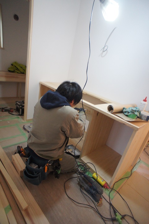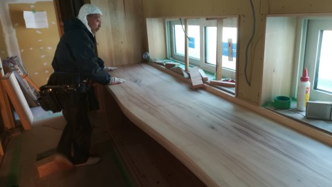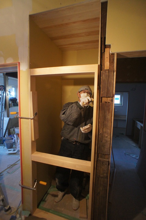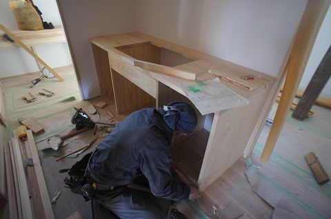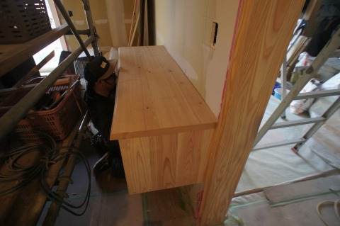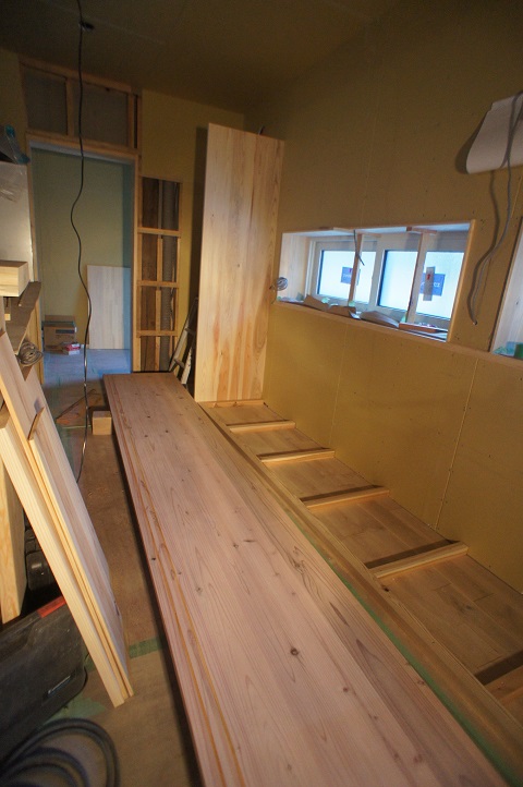 キッチン後ろの作業台兼用収納も制作が進んでいます。天板はこれも自社製材した幅60センチ超のカツラの一枚板です。立派です。