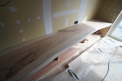またリビングのテレビ台も取付られました。天板はカツラの板(丸太から自社製材し乾燥させていた物です)